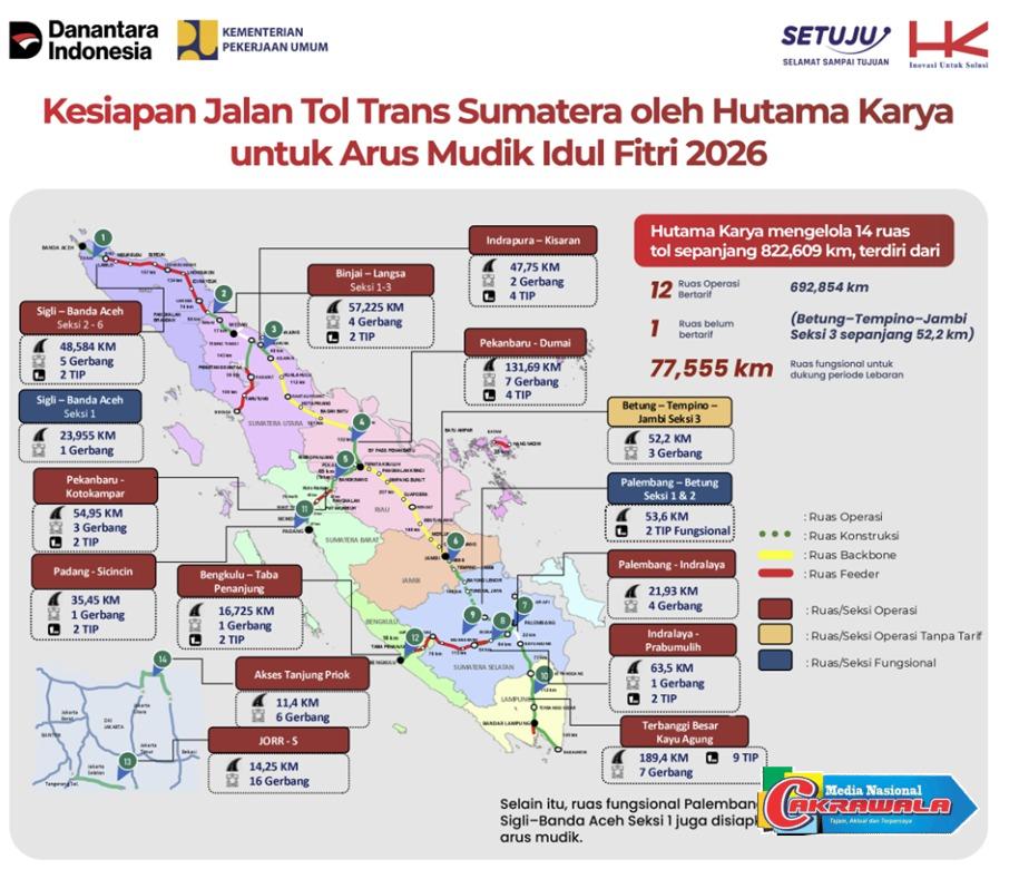 Jakarta,MN Cakrawala– Jaringan Jalan Tol Trans Sumatera (JTTS) yang dikelola PT Hutama Karya (Persero) kini telah mencapai 822,609 kilometer dan siap menjadi tulang punggung mobilitas masyarakat pada Mudik Lebaran 2026.