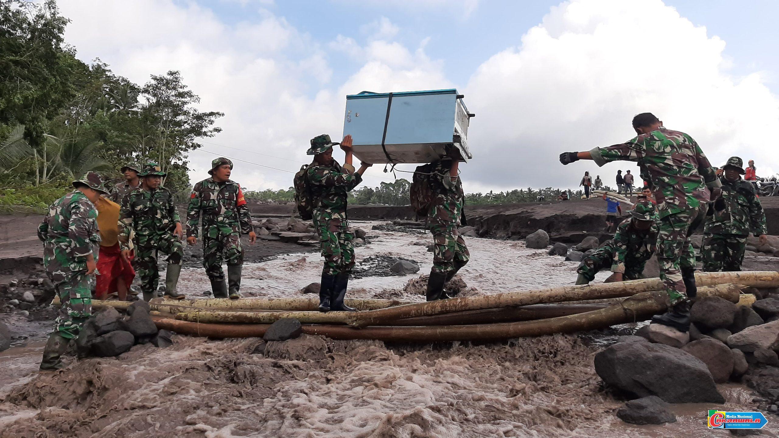 Lumajang,Cakrawala— Setelah jembatan darurat di Sungai Regoyo sukses dibangun sebagai akses utama evakuasi, prajurit Kodim 0821/Lumajang langsung bergerak cepat memastikan warga dapat melintas dengan aman. Pada Senin (8/11/2025), Peltu Erwin Setyo bersama personel TNI lainnya turun langsung mendampingi proses penyebrangan warga terdampak banjir lahar dingin di Dusun Sumberlangsep, Desa Jugosari, Kecamatan Candipuro.