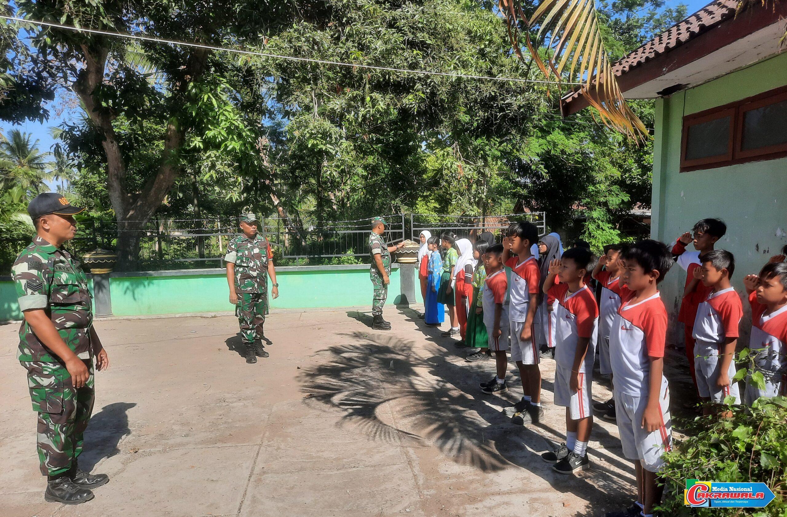 Bondowoso,MN Cakrawala-Kamis 27-07-2023,Suasana di halaman SDN Mrawan 1 nampak sedikit beda dari hari-hari biasa di jam pelajaran,karena nampak beberapa personil anggota TNI jajaran kodim 0822 bondowoso koramil 0822/11 tapen sedang melatih murid dalam hal baris berbaris atau PBB.