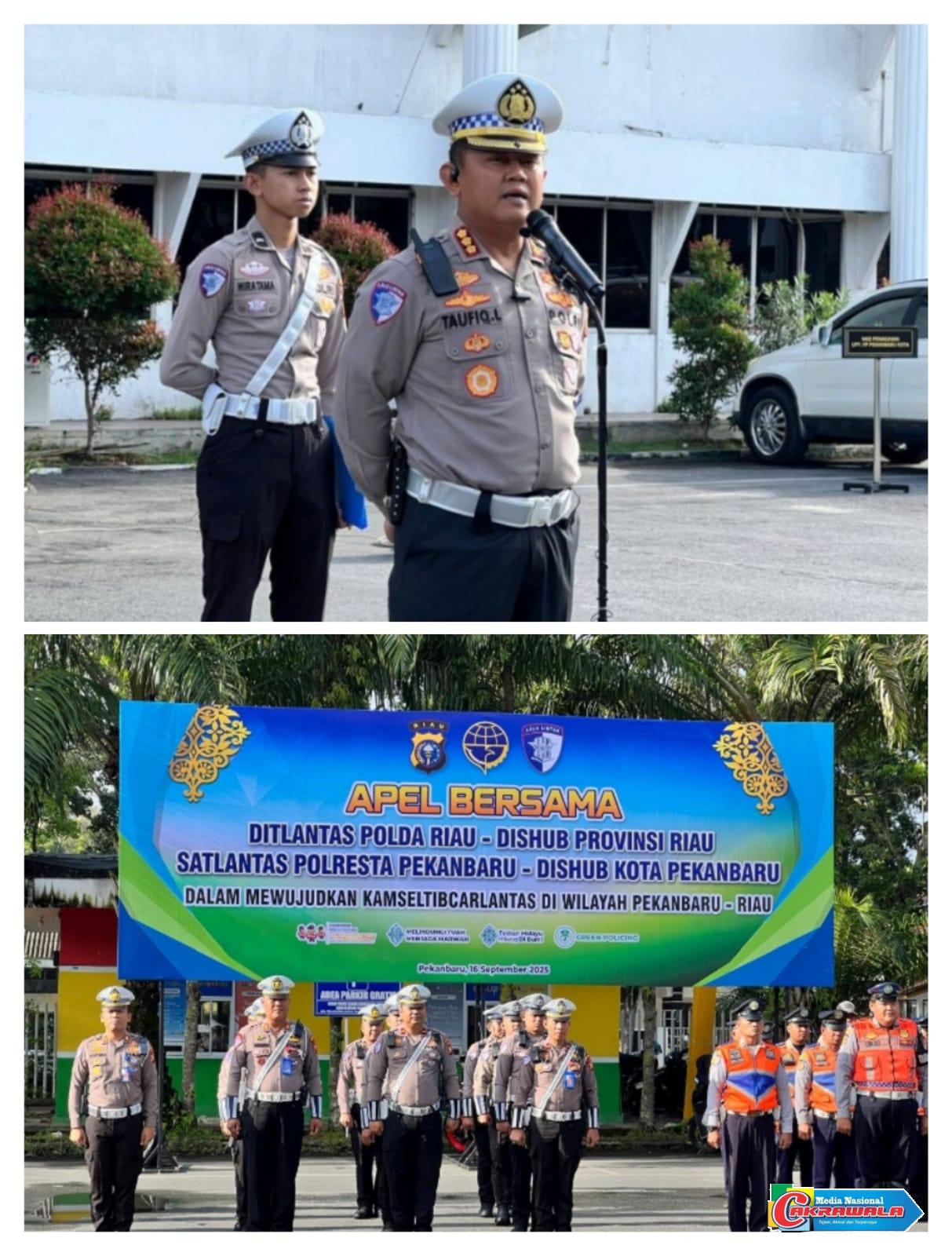Pekanbaru,Cakrawala– Direktorat Lalu Lintas (Ditlantas) Polda Riau bersama Dinas Perhubungan (Dishub) Provinsi Riau dan Dishub Kota Pekanbaru menggelar apel gabungan yang dilanjutkan dengan Tactical Floor Game (TFG) antisipasi kerawanan lalu lintas, Selasa (16/9/2025), di halaman Samsat Jalan Gadjah Mada Pekanbaru.