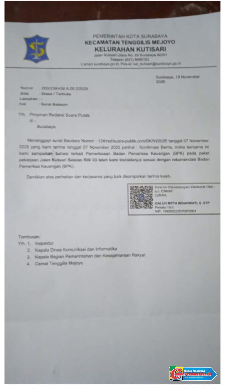 Dikonfirmasi media ini via surat, Lurah Kutisari, Galuh memberikan tanggapan, bahwa paket pekerjaan Dakel di Jalan Kutisari telah ditindaklanjuti sesuai dengan rekomendasi BPK (Badan Pemeriksa Keuangan, Selasa (11/11/2025).
