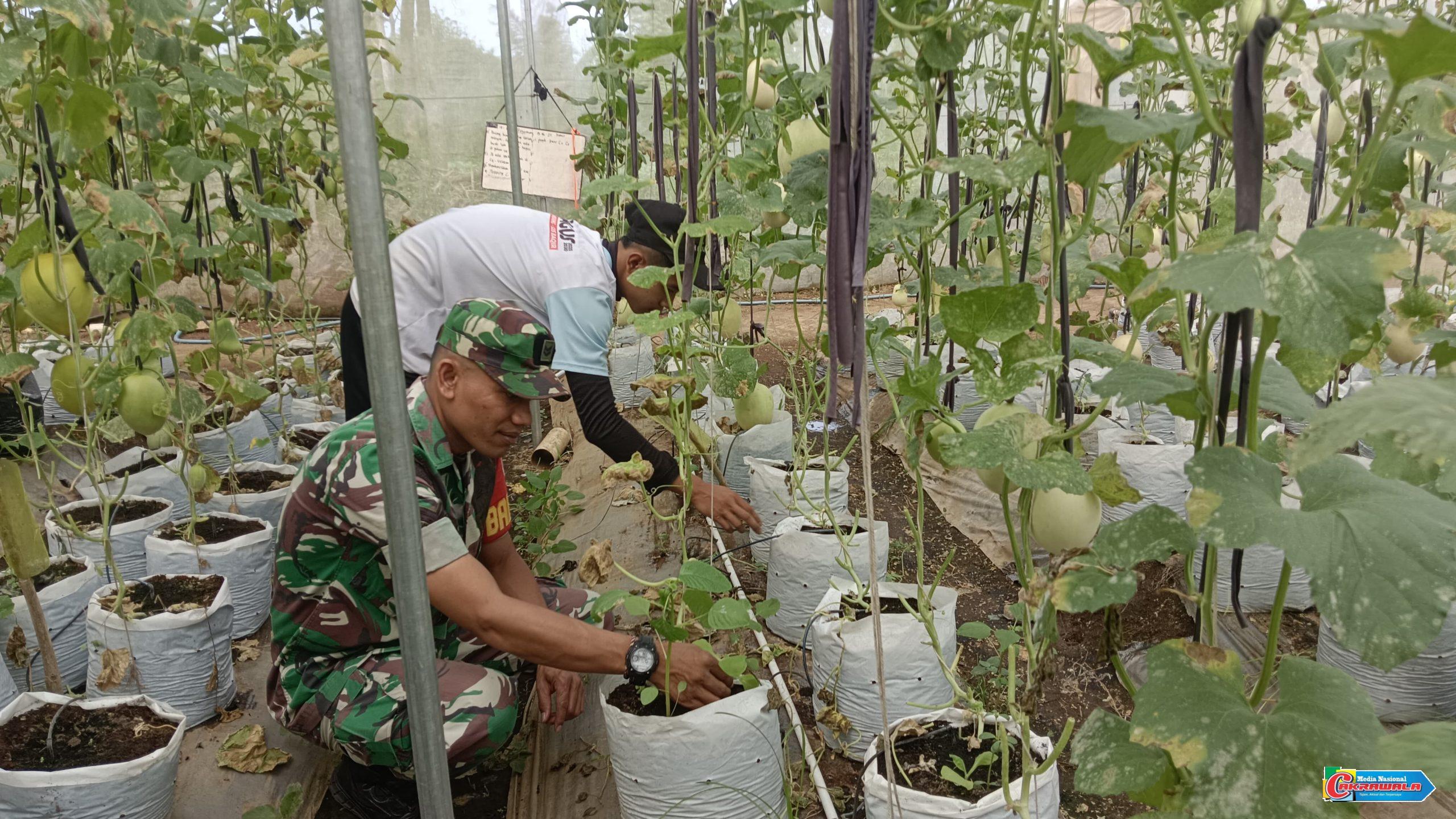 Bondowoso,Cakrawala-Dalam upaya mendukung ketahanan pangan dan meningkatkan kesejahteraan petani, Babinsa Desa Petung, Sertu M. Fauzi, melaksanakan pendampingan pemeliharaan tanaman melon di lahan milik Bapak Teguh Yudi Cahyono, Dusun Krajan, RT 02 RW 01 Desa Petung, Kecamatan Curahdami, pada Sabtu pagi (5/7/2025).
