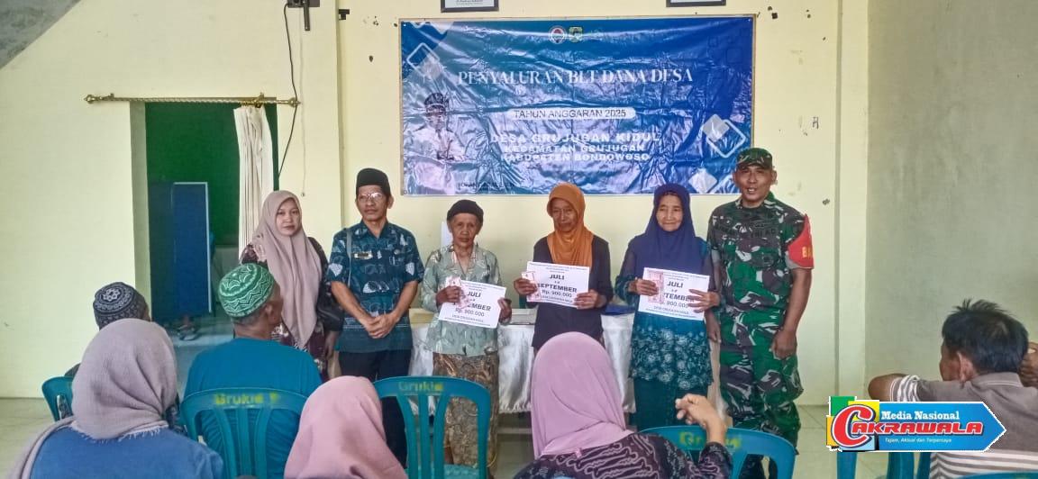 Bondowoso, MN Cakrawala — Kamis (2/10) Penyaluran Bantuan Langsung Tunai Dana Desa (BLT-DD) tahap III untuk bulan Juli, Agustus, dan September tahun anggaran 2025 dilaksanakan di Balai Desa Grujugan Kidul, Kecamatan Grujugan, Kabupaten Bondowoso. Kegiatan ini mendapat pendampingan langsung dari Babinsa Desa Grujugan Kidul, Serma Roni Faslah, guna memastikan proses berjalan aman dan tertib.