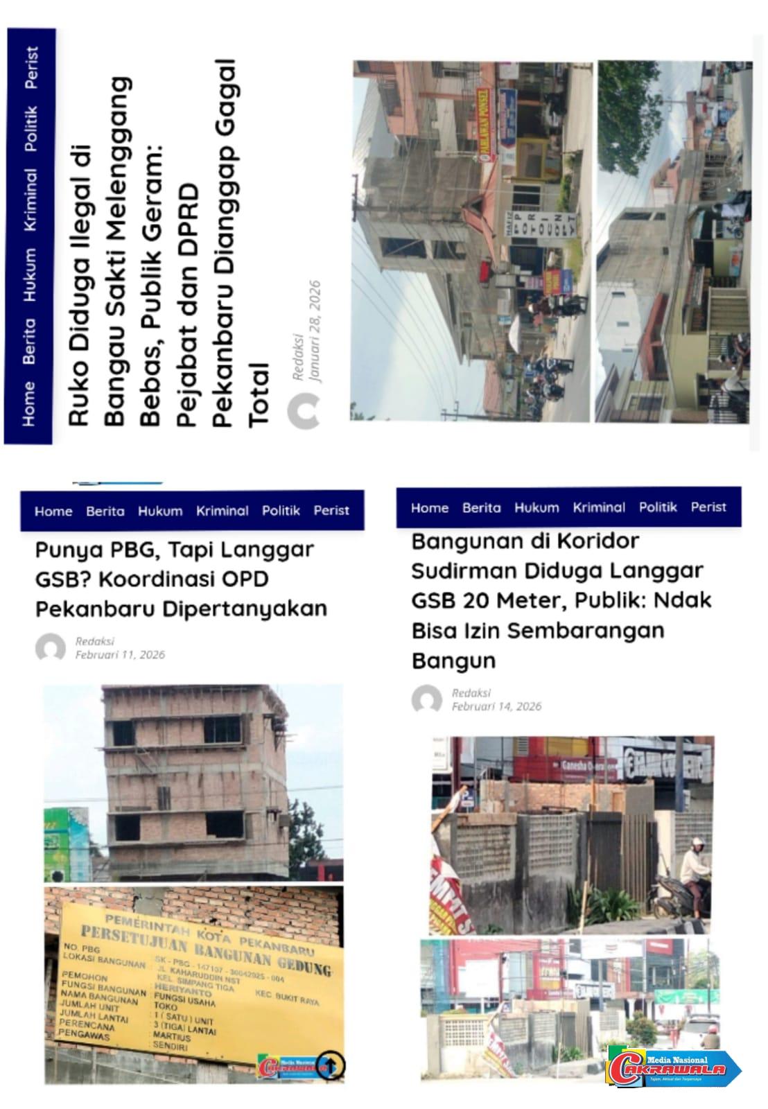 Pekanbaru,Cakrawala– Dugaan pelanggaran bangunan di Kota Pekanbaru kembali menyeruak ke ruang publik. Ruko di kawasan Bangau Sakti disebut-sebut belum memiliki Persetujuan Bangunan Gedung (PBG). Sementara itu, bangunan di koridor Jalan Jenderal Sudirman diduga telah mengantongi PBG namun tetap melanggar ketentuan Garis Sempadan Bangunan (GSB) hingga 20 meter.
