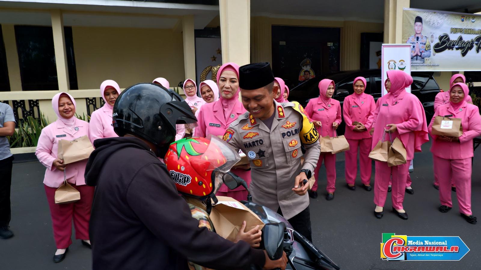 Dalam kegiatan ini di bagikan takjil sebanyak 200 paket kepada tukang becak dan pengendara jalan yang melintas di depan Mapolres Bondowoso.