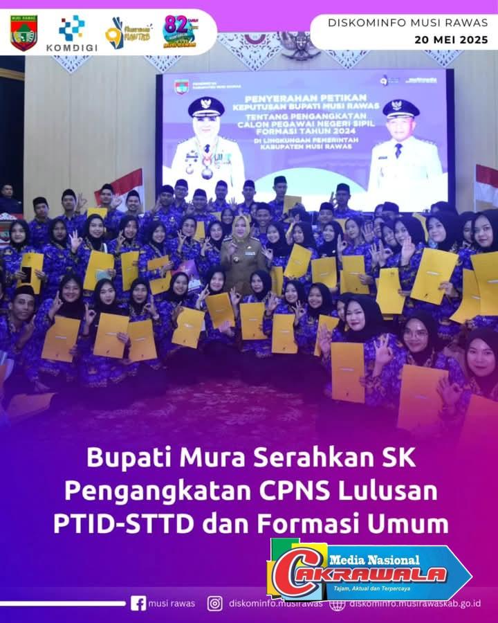 Musi Rawas, Media Nasional Cakrawala-Hj. Ratna Machmud Menyerahkan Keputusan tentang Pengangkatan CPNS dari Lulusan Politeknik Transportasi Darat Indonesia-Sekolah Tinggi Transportasi Darat dan CPNS Formasi Umum di Lingkungan Pemerintah Kabupaten Musi Rawas, bertempat di Auditorium Pemkab Musi Rawas, Senin (19/05/2025).