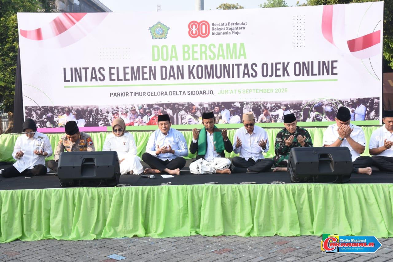 Sidoarjo, MN Cakrawala– Ribuan Ojek Online/Ojol se Kabupaten Sidoarjo berkumpul di parkir Timur GOR Sidoarjo, Jumat, (5/9). Pemkab Sidoarjo mengajak mereka untuk doa bersama bagi almarhum Affan Kurniawan. Doa bersama diawali dengan sholat ghoib bagi mendiang Affan Kurniawan. Sholat ghoib dipimpin Pengasuh Ponpes Al Basuni Siwalanpanji Buduran Gus Hasan Jamil Kholil. Usai sholat mereka juga memperoleh 5 kg beras. Selain itu Pemkab Sidoarjo juga memberikan mereka kartu BPJS Kesehatan.