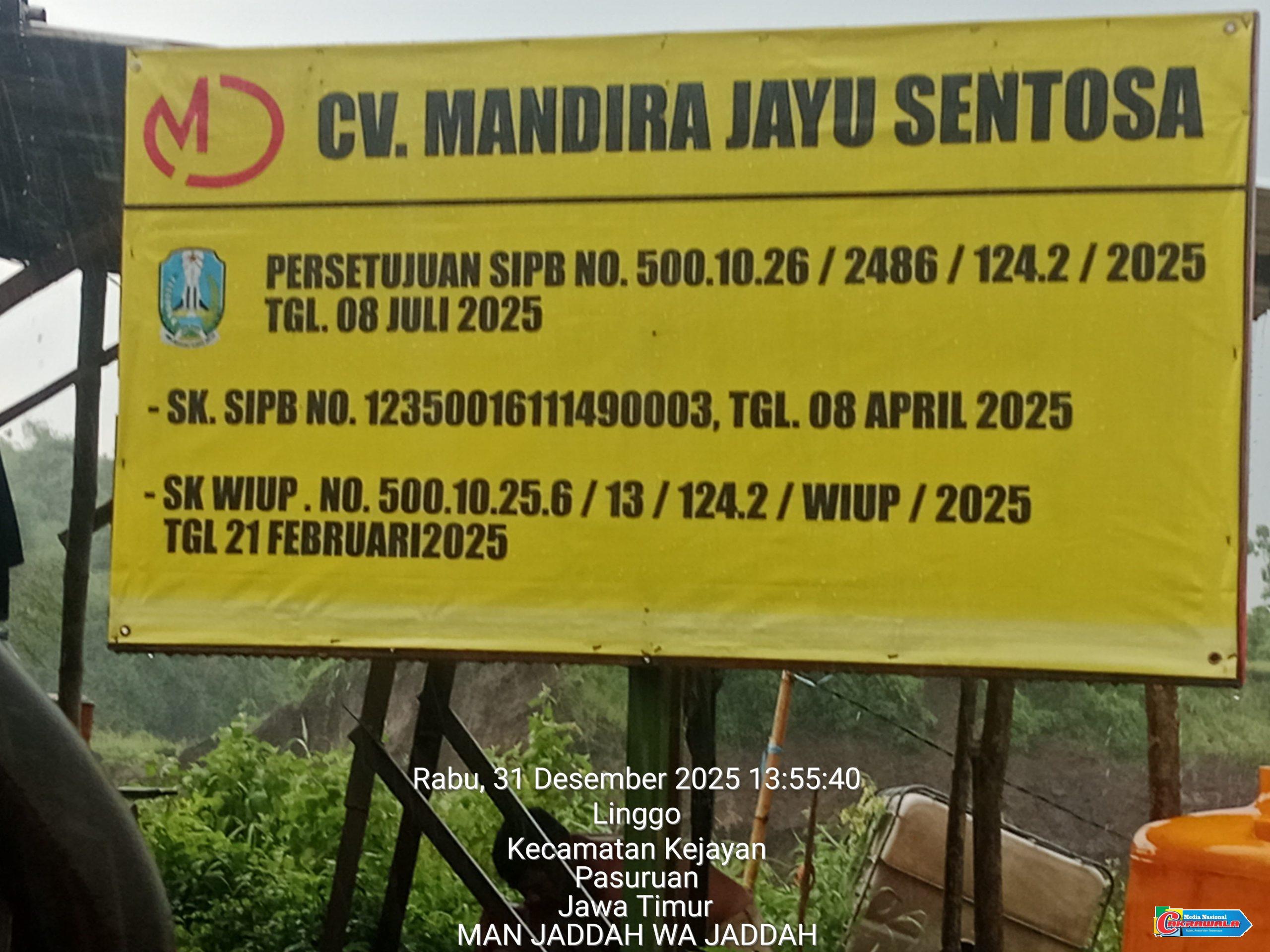 Berdasarkan data Kementerian ESDM provinsi yang dihimpun, CV Mandira Jayu Sentosa secara administratif, perusahaan ini memegang Izin Usaha Pertambangan Operasi Produksi (IUP OP) yang masih berlaku hingga 18 Juni 2026 untuk melakukan kegiatan penggalian, pengolahan, dan penjualan pasir pasang di wilayah konsesi seluas 8,67 hektar di Lokasi: Desa Randu Gung, Kec. Kejayan, Kabupaten Pasuruan, bukan di Lokasi desa Linggo, Kecamatan Kejayan, Kab. Pasuruan.
