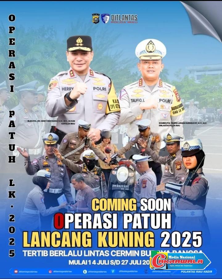 Pekanbaru,Cakrawala-Kepolisian Daerah Riau akan menggelar Operasi Patuh Lancang Kuning 2025 mulai tanggal 14 hingga 27 Juli 2025. Operasi ini merupakan bagian dari upaya meningkatkan disiplin dan keselamatan berlalu lintas di jalan raya, serta membangun budaya tertib yang menjadi cermin peradaban bangsa.