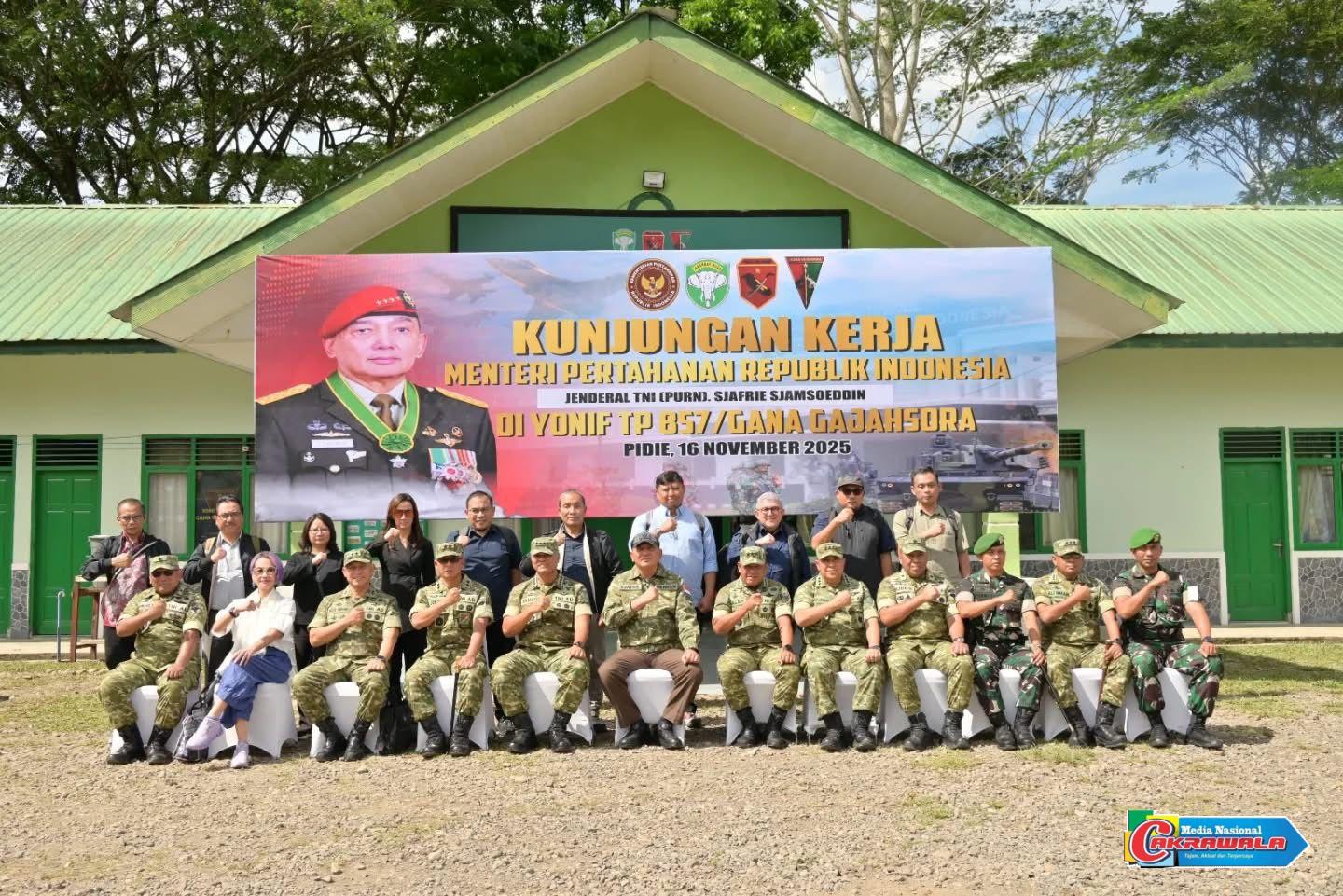 Pidie,Cakrawala– Komandan Kodim 0102/Pidie, Letkol Inf Andi Irsan M. Han, turut mendampingi Kasdam Iskandar Muda (IM) Brigjen TNI Yudha Fitri, Kapoksahli Pangdam IM Brigjen TNI Bambang Sulistyo Heri, S.Sos., M.Han, serta Danrem 011/Lilawangsa Kolonel Inf Ali Imran dalam penyambutan kunjungan kerja Menteri Pertahanan RI, Jenderal TNI (Hor) Purn. Sjafrie Sjamsoeddin, di Batalyon Infanteri Teritorial Pembangunan (Yonif TP) 857/Gana Gajahsora, Kecamatan Mane, Kabupaten Pidie, Minggu (15/11/2025).