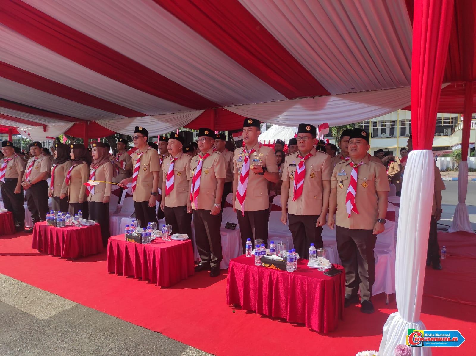 Letkol Arm Indra Andriansyah membacakan sambutan tertulis Ketua Kwartir Nasional Pramuka Komjen Pur. Budi Waseso.