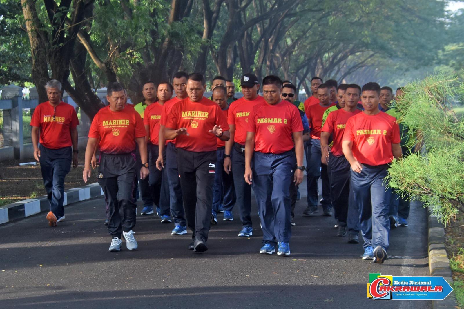 SIDOARJO, MN CAKRAWALA. COM – Komandan Komando Latih Korps Marinir (Dankolatmar) Kolonel Marinir Dede Harsana, S.A.P., M.Han mendampingi Wakil Komandan Korps Marinir (Wadan Kormar) Brigjen TNI (Mar) Suherlan, S.E., M.M., M.Sc., CHRMP. melaksanakan olahraga bersama di Ksatrian Marinir Moekijat Pasmar 2, Gedangan, Sidoarjo, Kamis (04/07/2024).