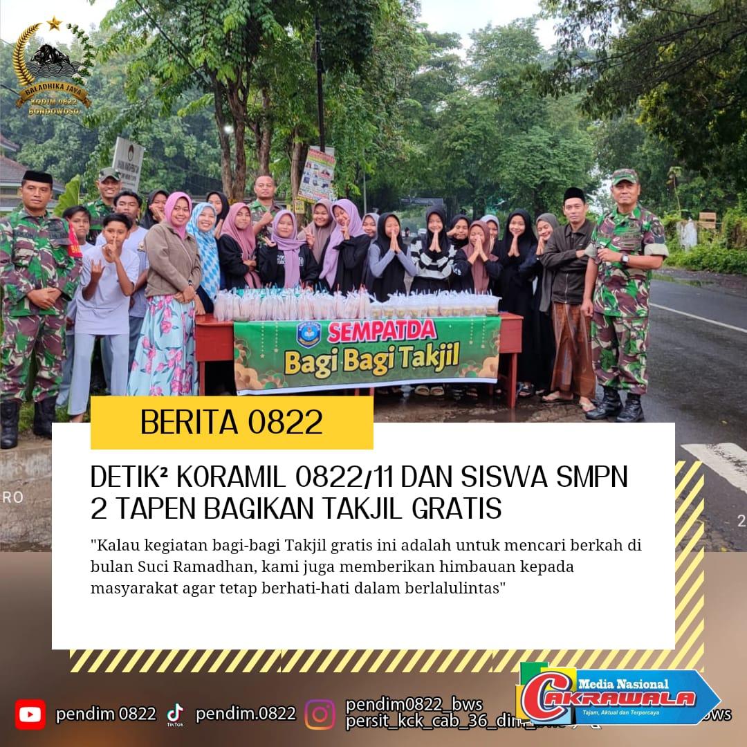 Bondowoso,MNCakrawala– Babinsa Koramil 0722/11 Tapen dan SMPN 2 Tapen membagikan takjil gratis pada masyarakat menjelang waktu berbuka puasa. Pembagian takjil ini dilaksanakan di sepanjang jalan di depan SMPN 2 Tapen Jalan Raya Situbondo Dusun Krajan Desa Tapen Kecamatan Tapen Kabupaten Bondowoso, Kamis (28/3).