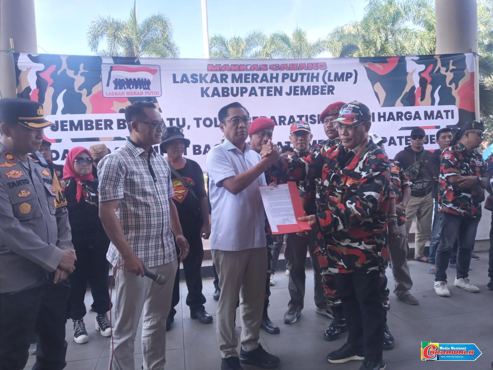 Jember,MN Cakrawala-Sekitar 100 anggota Laskar Merah Putih (LMP) Markas Cabang Jember menggelar aksi damai di gedung DPRD Jember pada Senin (1/9/2025).