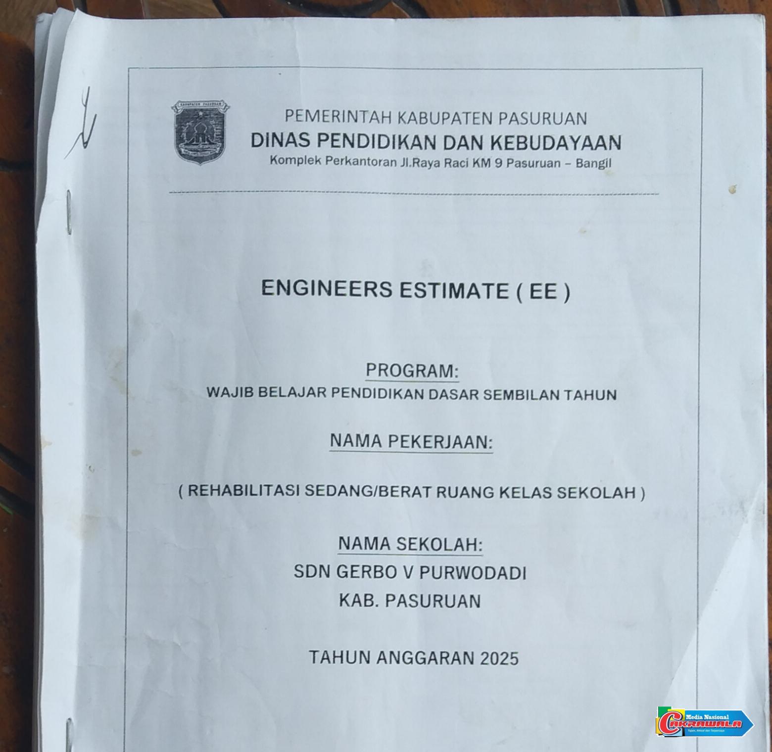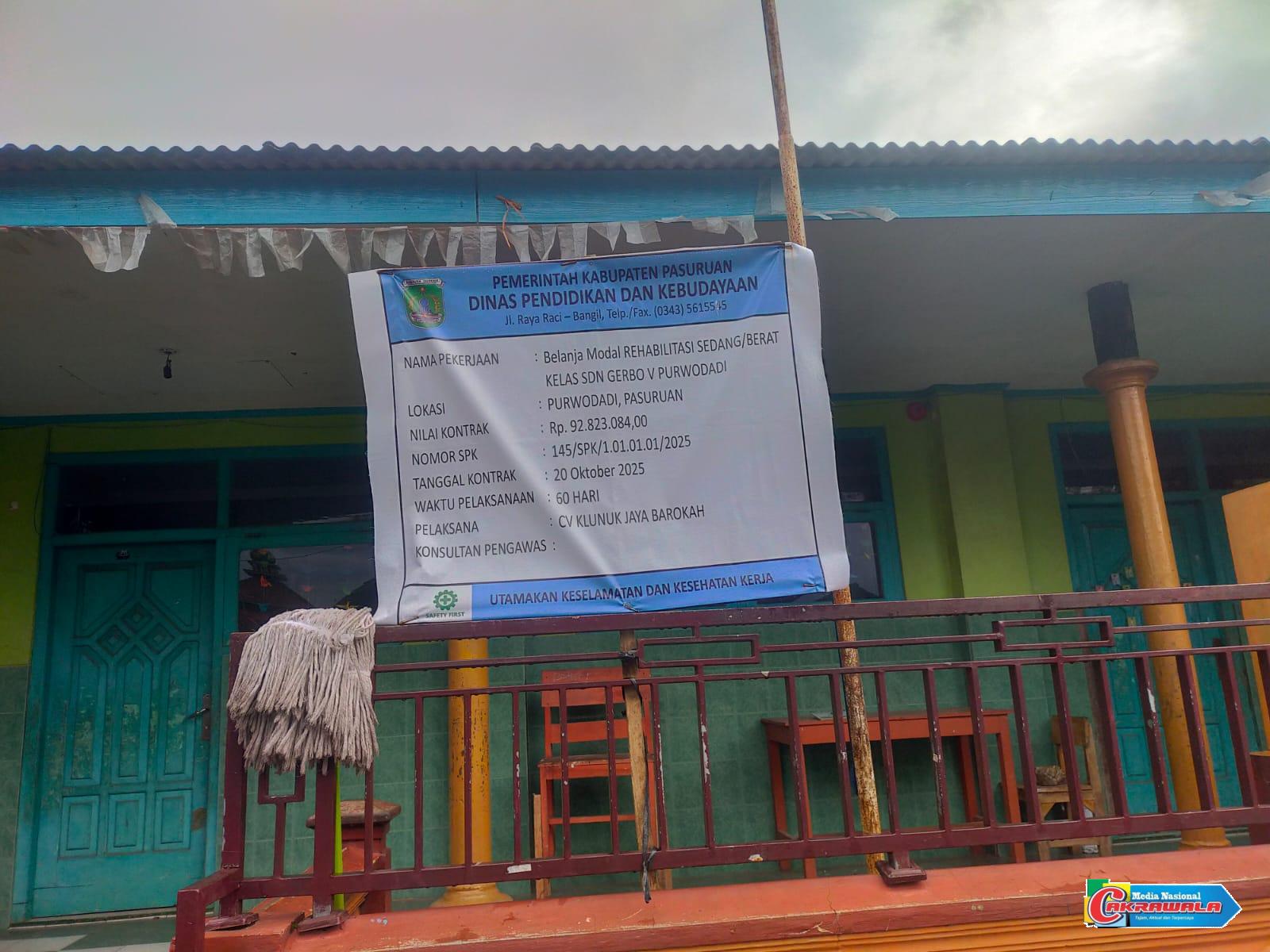 Pasuruan,MN Cakrawala-Sungguh miris proyek Rehabilitasi Dinas Pendidikan SDN V GERBO kecamatan Purwodadi Pasuruan,dengan pagu angaran Rp 93 340 000 Taun Angaran 2025 di duga melenceng dari speck.