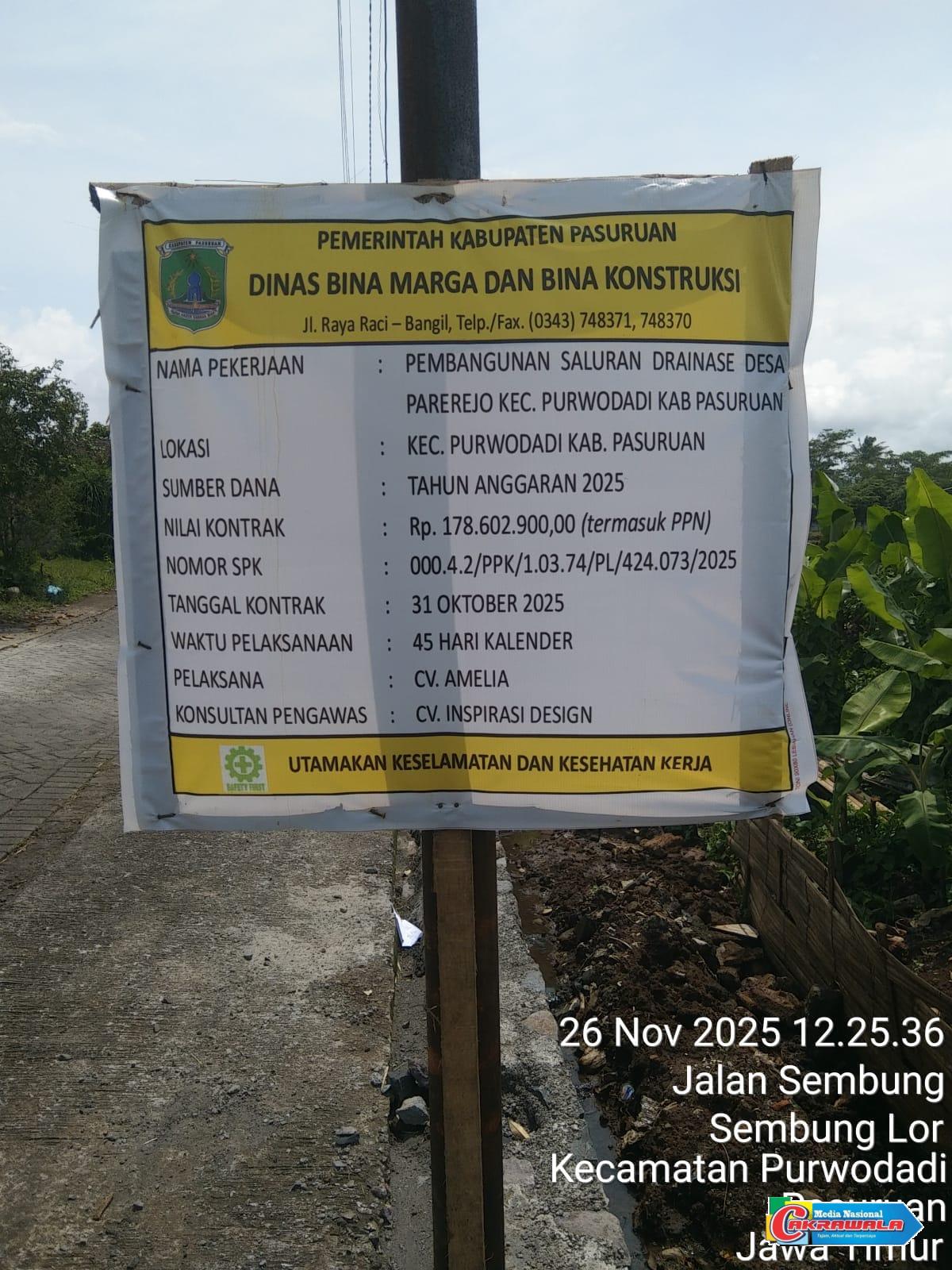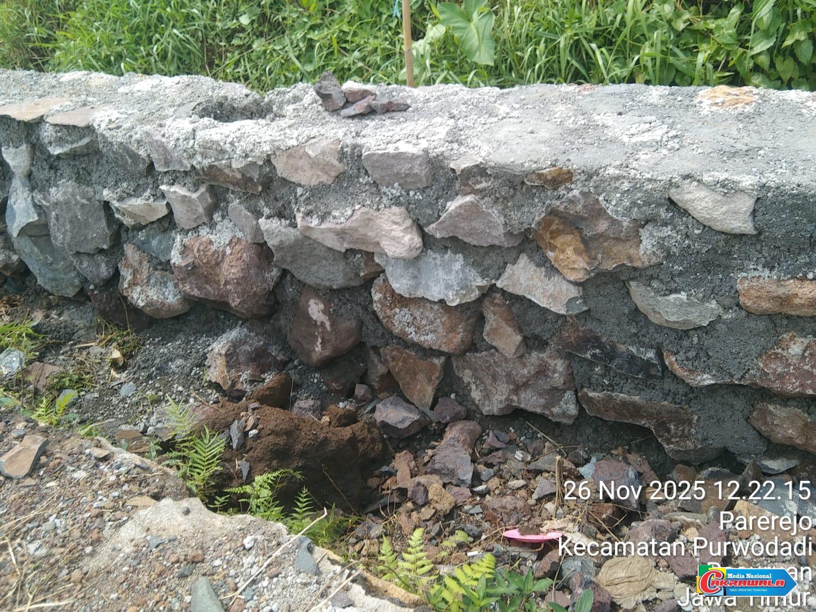 Pasuruan, Cakrawala.com-Diduga Proyek milik dinas binamarga dan bina kontruksi dalam pengerjaan pembangunan saluran Drainase di desa parerejo kecamatan Purwodadi kabupaten Pasuruan terkesan asal jadi.