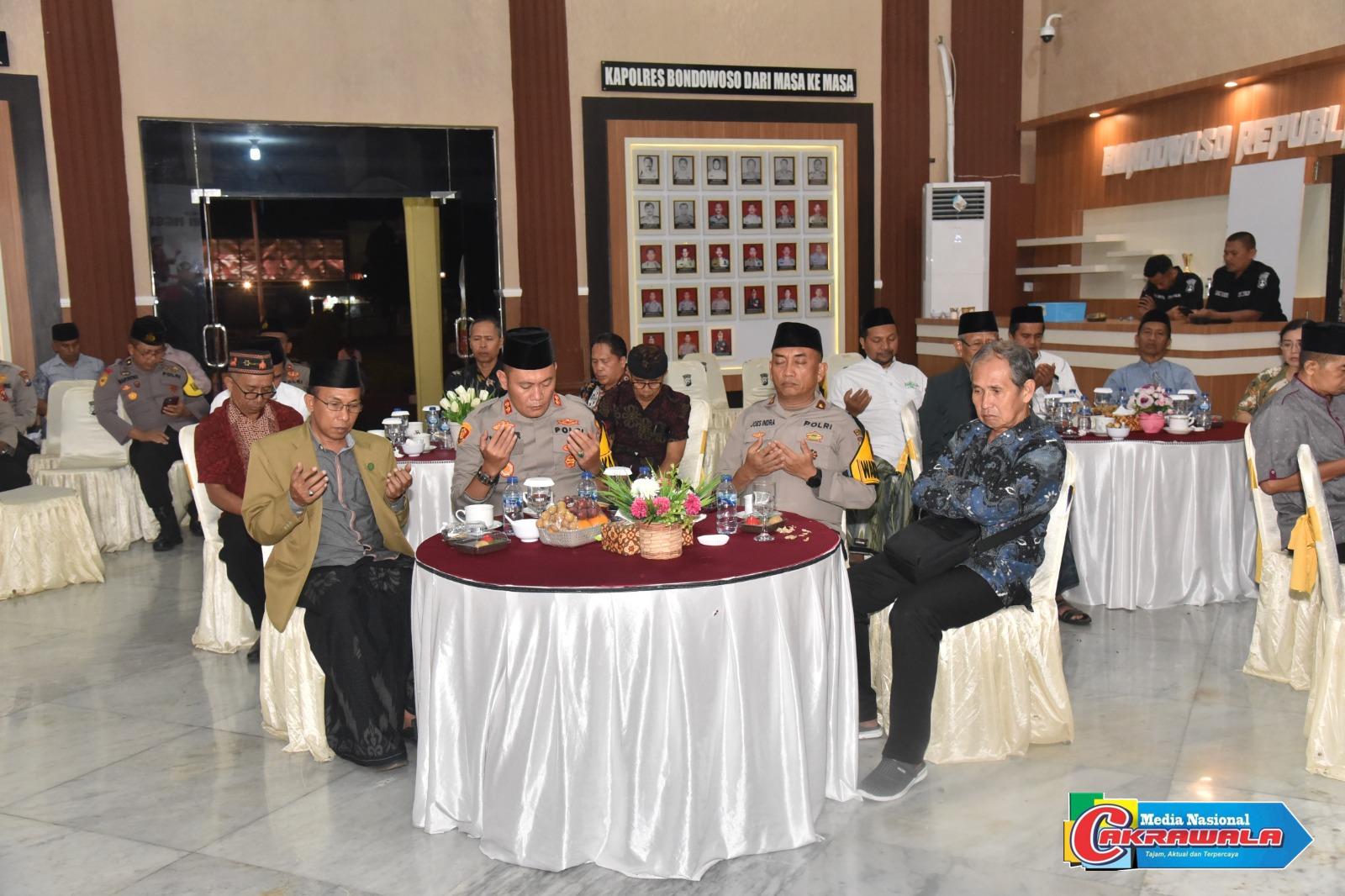 Bondowoso,MNCakrawala– Polres Bondowoso menggelar doa bersama menyambut HUT Bhayangkara Ke-78. Doa bersama ini digelar di Lobby polres Bondowoso dan diikuti sejumlah tokoh lintas agama dan jajaran Polres Bondowoso bersama para Bhayangkari. Jumat (28/6/2024)
