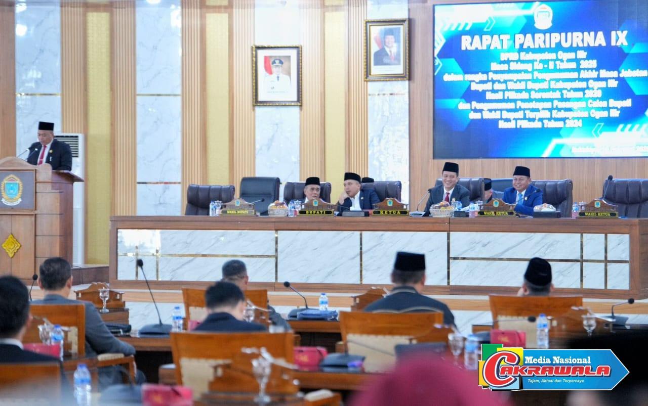 Ogan Ilir-MNCakrawala,Dewan Perwakilan Rakyat Daerah (DPRD) Kabupaten Ogan Ilir hari ini mengelar sidang paripurna penyampaian pengumuman akhir masa jabatan Bupati Ogan Ilir hasil Pilkada Serentak 2020, sekaligus pengumuman penetapan pasangan calon bupati dan wakil bupati terpilih hasil Pilkada 2024, di Gedung Paripurna DPRD Kabupaten Ogan Ilir, Senin (10/2/2025).