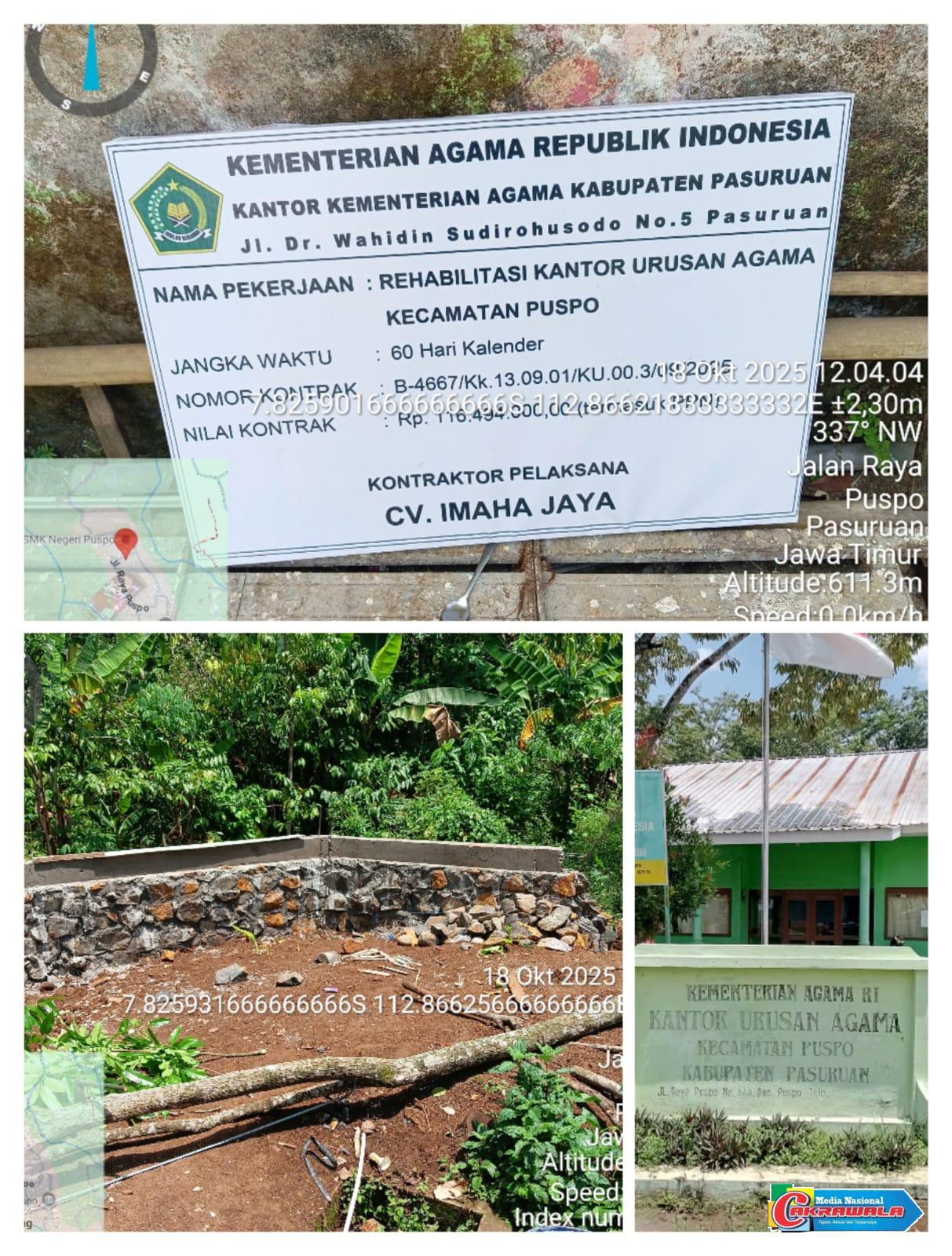Pasuruan, MN Cakrawala, 18 Oktober 2025-Proyek rehabilitasi Kantor Urusan Agama (KUA) di salah satu kecamatan puspo di Kabupaten Pasuruan, Yang di kerjakan oleh (CV IMAHA JAYA) nilai kontrak Rp116.494.000,00 dan jangka waktu pengerjaan 60 hari kalender menjadi sorotan publik.