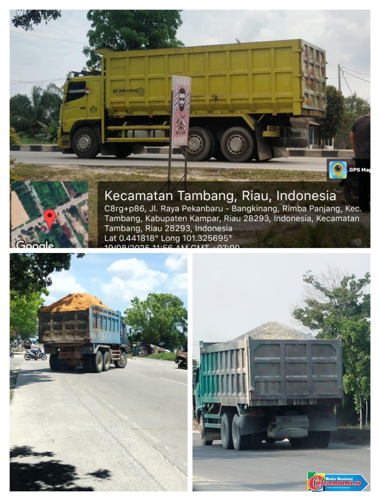 Pantauan di Desa Rimbo Panjang, Kecamatan Tambang, Kabupaten Kampar, Riau, Selasa (19/8/2025), memperlihatkan sebuah dump truck dengan dimensi bak bertuliskan P = 640 cm, L = 240 cm, dan T = 180 cm. Angka ini jauh melampaui ketentuan tinggi bak maksimal 1.000 mm yang diatur dalam Surat Dirjen Perhubungan Darat Nomor AJ.502/12/16/DRJD/2020.