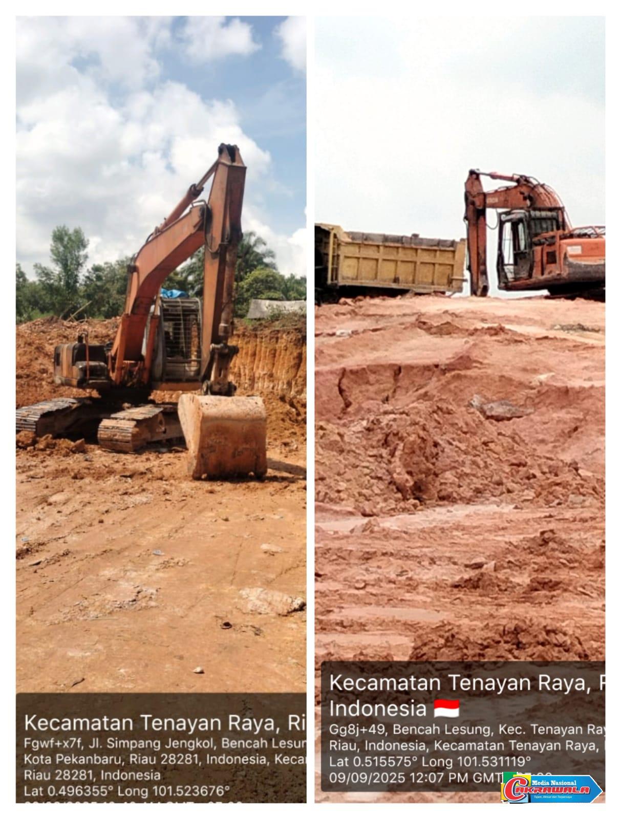 Pekanbaru,Cakrawala-Aktivitas pengerukan tanah di Kecamatan Tenayan Raya menimbulkan tanda tanya besar. Ekskavator dan dump truck terlihat bebas beroperasi tepat di samping pintu gerbang Perkantoran Pemerintah Kota Pekanbaru, Tenayan Raya, Selasa (9/9/2025).