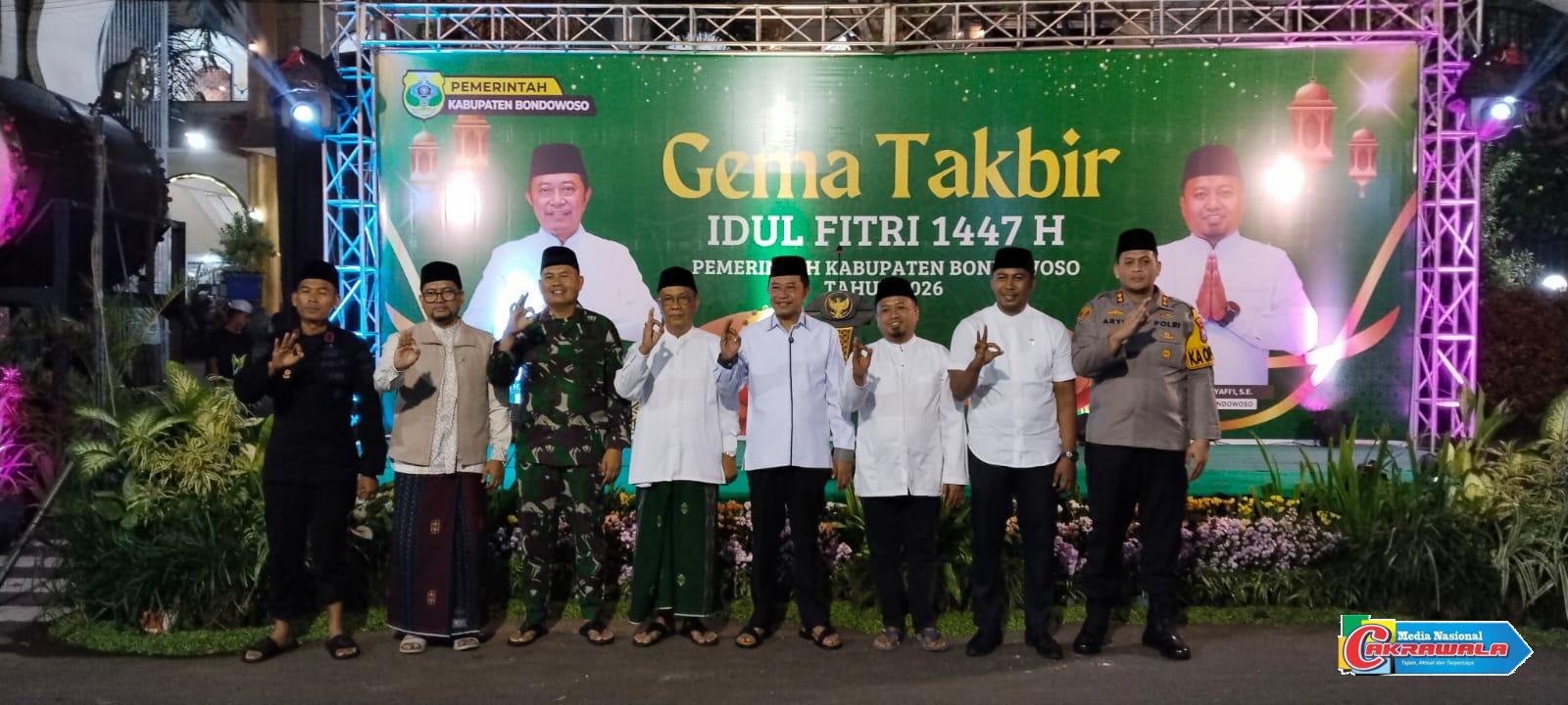 Bondowoso,MN Cakrawala – Suasana malam Idul Fitri 1447 H di Kabupaten Bondowoso berlangsung khidmat dan semarak melalui kegiatan Gema Takbir yang digelar di depan Masjid Agung At-Taqwa, Jumat (20/3/2026) malam. Acara yang diselenggarakan oleh Pemerintah Kabupaten Bondowoso ini dihadiri sekitar 100 orang dari unsur Forkopimda, tokoh agama, serta masyarakat, dengan penanggung jawab kegiatan Sekda Bondowoso, Dr. Fathur Rozi, M.Fil.I.