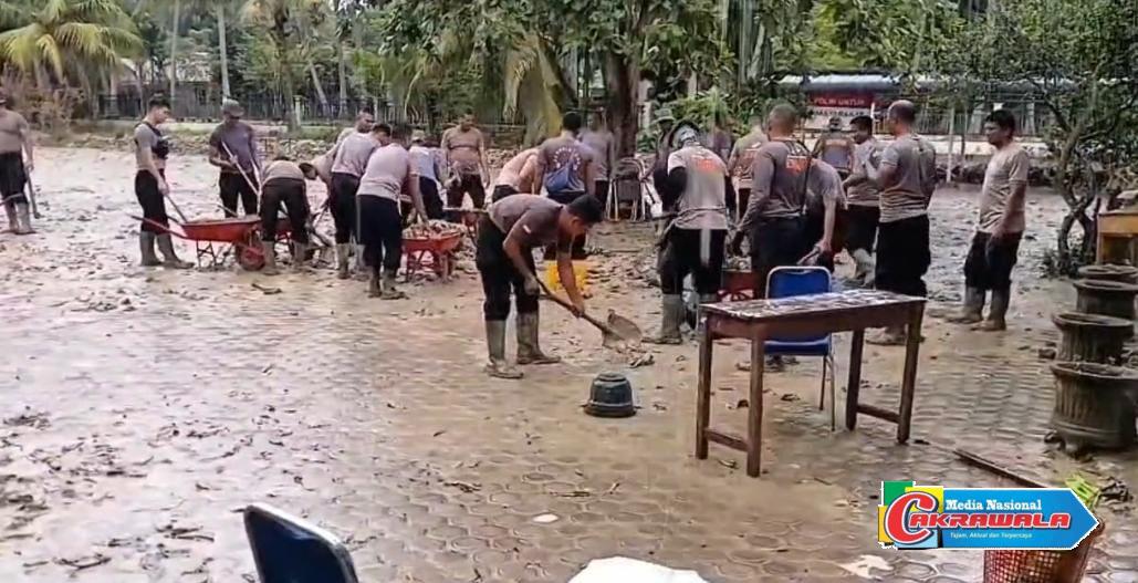Aceh Utara,Cakrawala – Polri melalui personel Satuan Brimob Polda Aceh yang tergabung dalam BKO Operasi Aman Nusa II bergerak cepat membantu pemulihan fasilitas pendidikan pascabencana banjir. Aksi tersebut diwujudkan melalui bakti sosial pembersihan lingkungan Sekolah Dasar Negeri (SDN) 15 Seunuddon, Kecamatan Seunuddon, Kabupaten Aceh Utara, Jumat (2/1/2026).