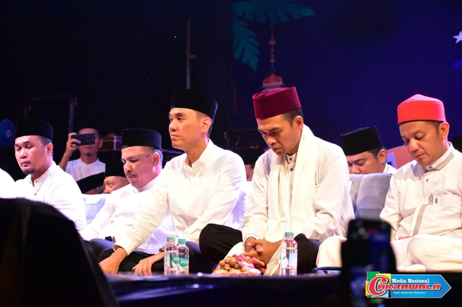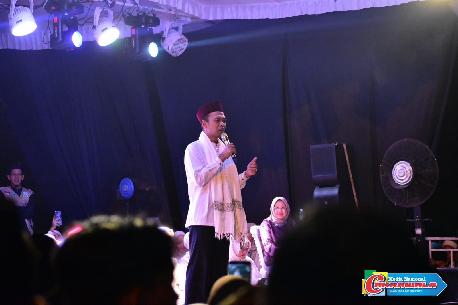 UAS membuka ceramah dengan ciri khas humor, ringan namun bermakna, mengalir menciptakan suasana hangat di tengah lantunan sholawat yang diikuti lambaian tangan jamaah.