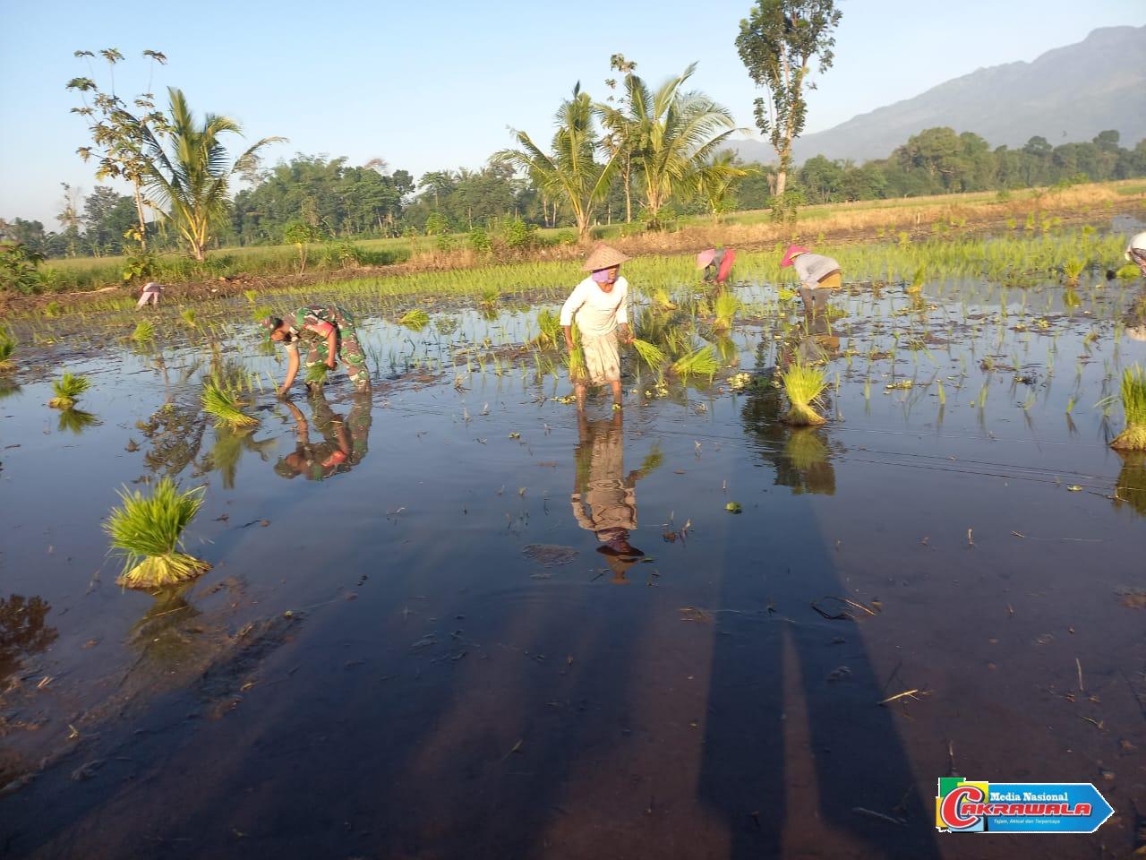 Bondowoso,Cakrawala-Menunjukkan kepedulian dan kedekatannya dengan masyarakat, Babinsa Desa Koncer Kidul, Serka Lugito, dari Koramil 0822/04 Tenggarang, turun langsung ke sawah membantu petani menanam padi di Dusun Rowo, Desa Koncer Kidul, Kecamatan Tenggarang, Kabupaten Bondowoso, Minggu (6/7).