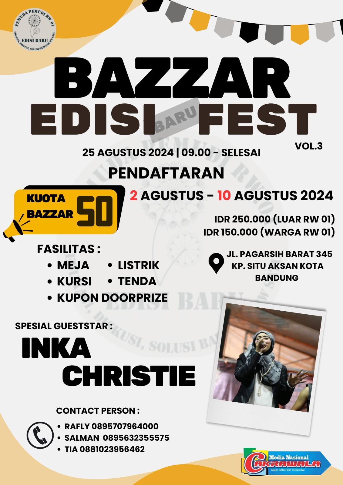 Dengan didukung penuh ketua RW Rachmat Suhendar serta dimotori langsung management artis senior kawakan Budi Eko akan menggelar acara akbar pada tanggal 25 agustus 2024 bertajuk “Edisi Baru Fest 2024” dimeriahkan artis legend Inka Christie & Black Jade Band serta dipandu oleh MC Devri Andriana.