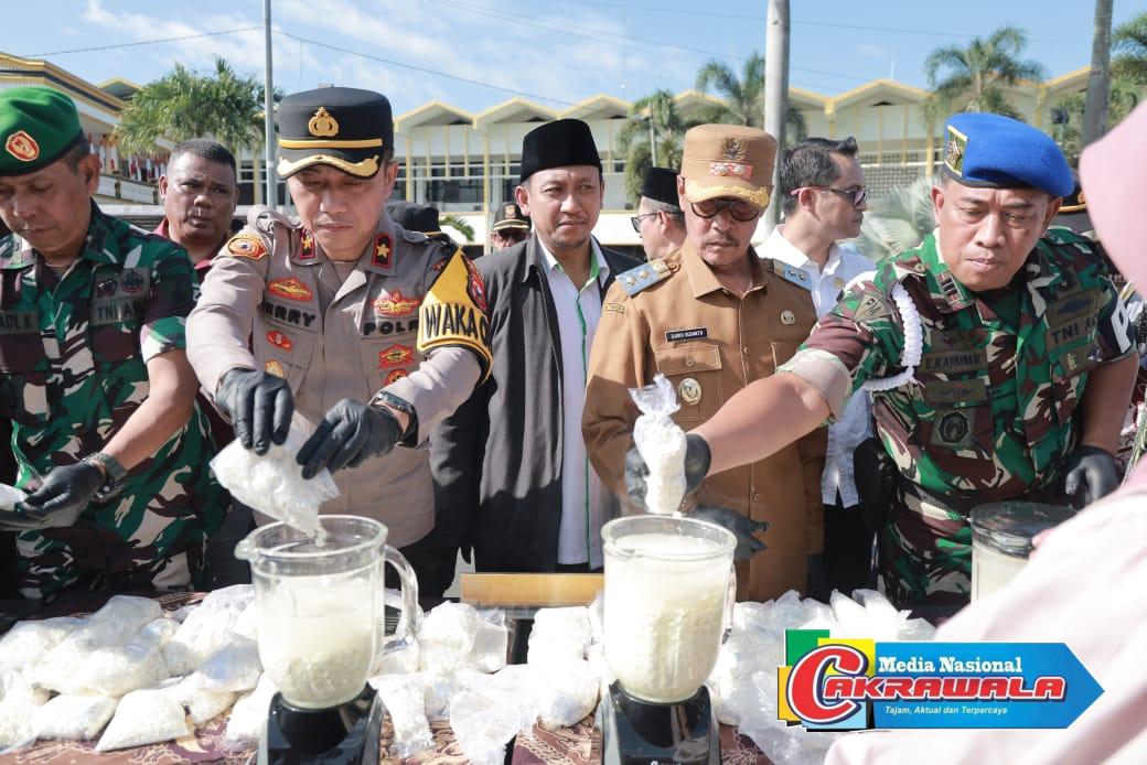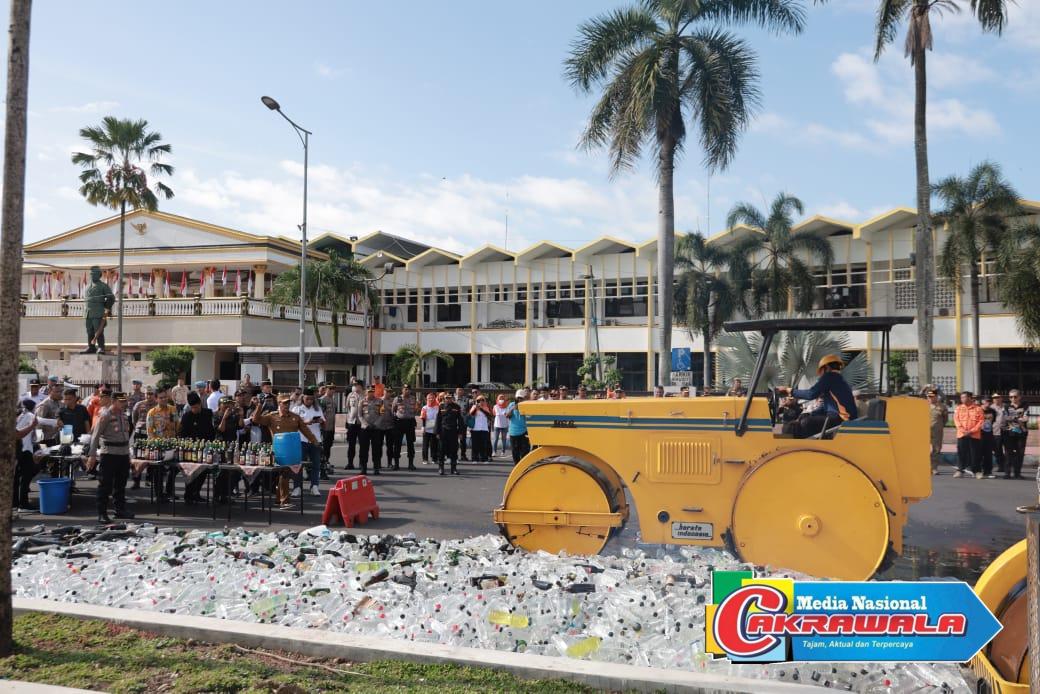Pemusnahan barang bukti dilakukan secara simbolis oleh jajaran Forkopimda, disaksikan oleh tokoh masyarakat dan elemen terkait. Minuman keras serta narkotika dimusnahkan dengan cara dituangkan ke dalam lubang dan dihancurkan, sementara knalpot brong dipotong menggunakan alat khusus.