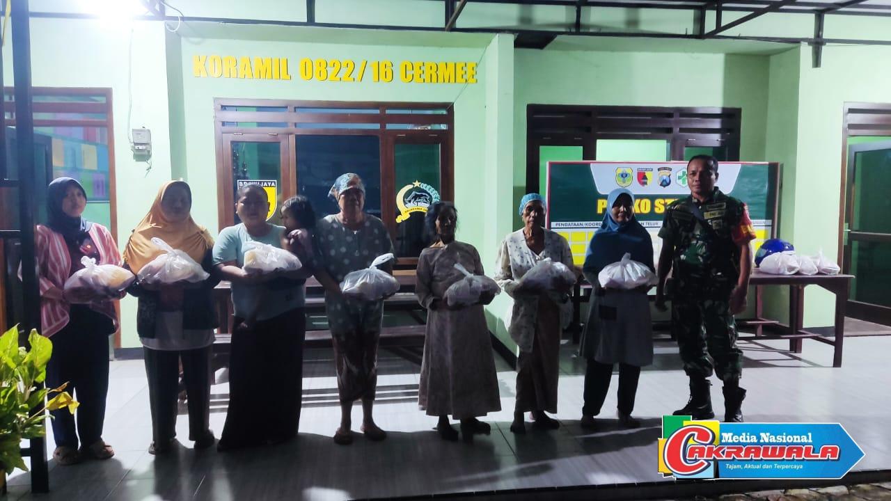 Dalam aksi sosial ini. Komandan Rayon Militer (Danramil) Cermee melalui Babinsa Serka Nasrudin. menyerahkan bantuan secara langsung kepada warga yakni Paket sembako yang diberikan berisi beras, minyak goreng, gula, mie instan, serta kebutuhan pokok lainnya.