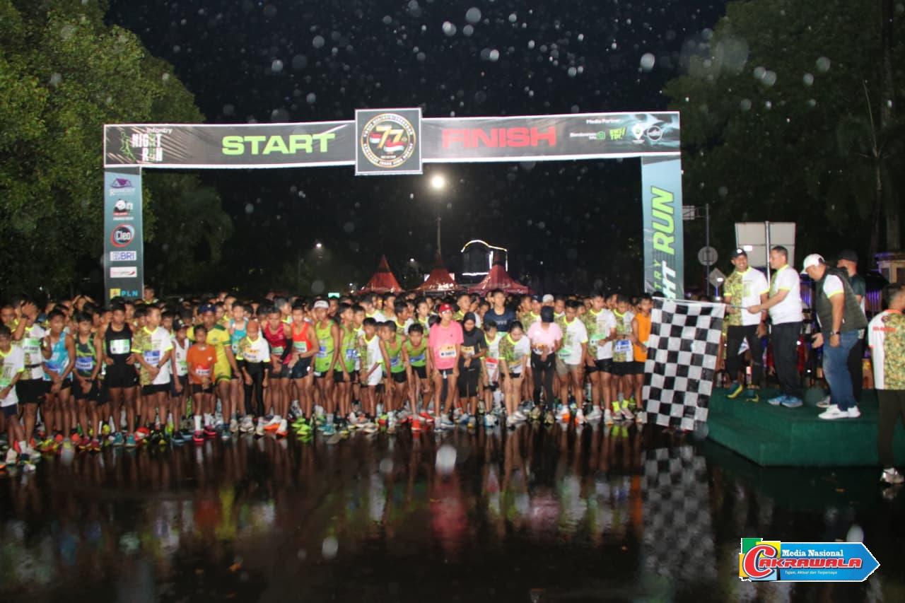 Ajang lari malam sejauh 5 kilometer ini resmi dimulai pukul 19.00 WIB dan diikuti peserta dari berbagai daerah. Selain menghadirkan sensasi lari malam yang berbeda, panitia juga menyiapkan total hadiah puluhan juta rupiah, jersey eksklusif, serta aksesori glow yang membuat suasana semakin semarak di tengah hujan.
