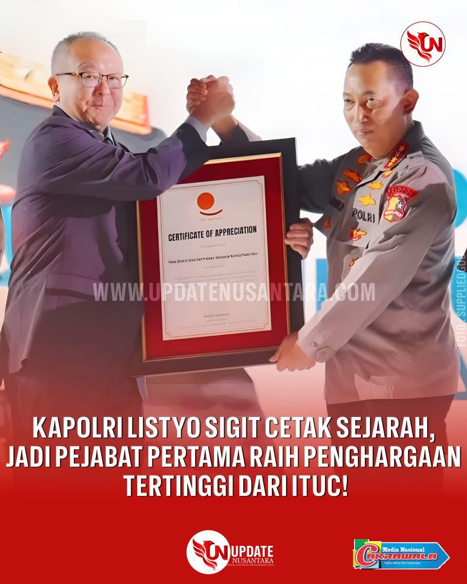 JAKARTA,Cakrawala– Kapolri Jenderal Pol. Listyo Sigit Prabowo menerima penghargaan tertinggi dari International Trade Union Confederation (ITUC), organisasi buruh terbesar di dunia yang bermarkas di Brussel, Belgia. Penghargaan ini diserahkan langsung oleh Sekretaris Jenderal ITUC Asia Pasifik, Shoya Yoshida, dalam perayaan Hari Ulang Tahun KSPSI ke-51 di Indonesia Arena, Gelora Bung Karno, Jakarta, Kamis (11/7/2025).