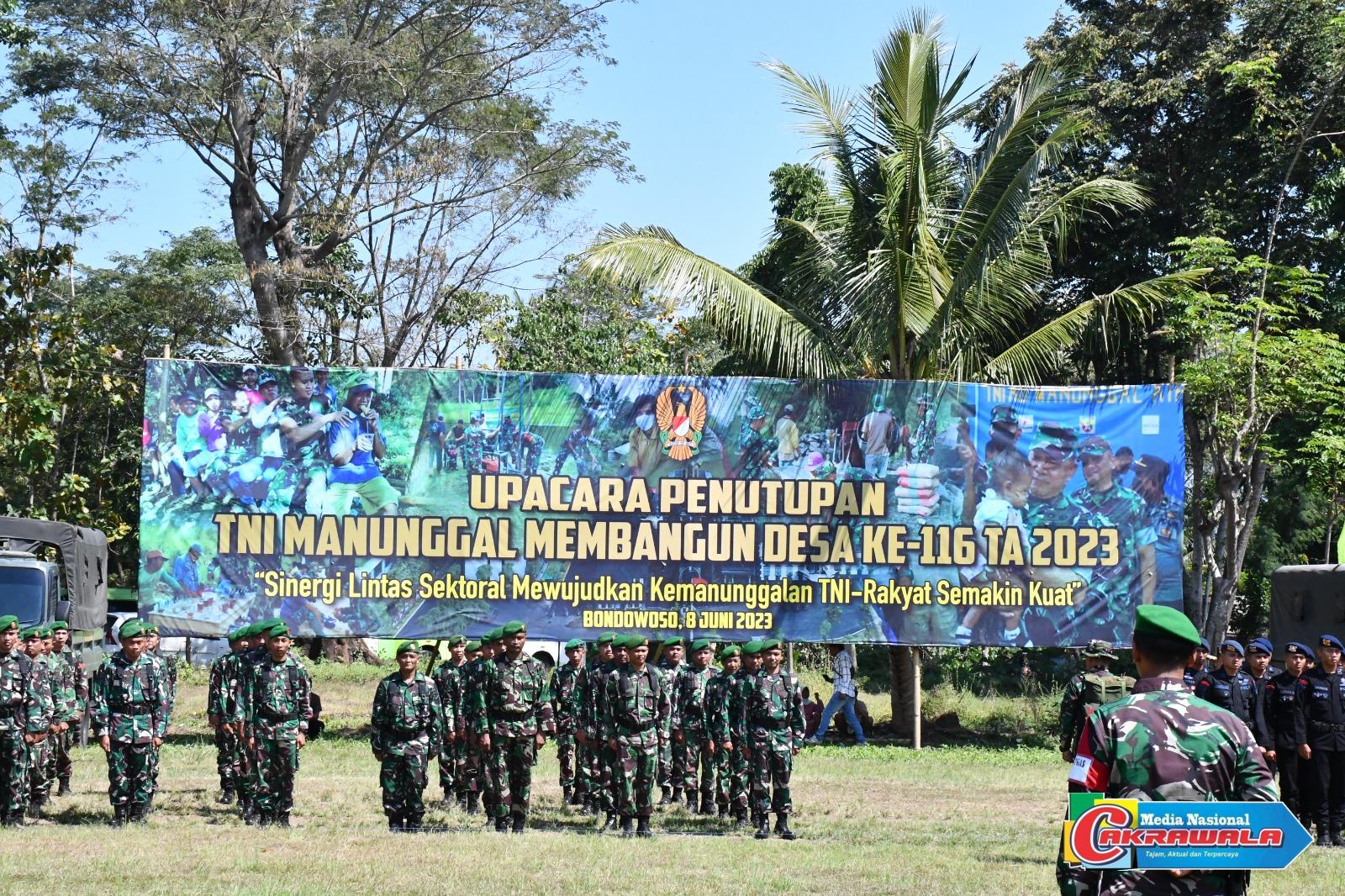 Bondowoso, MNCakrawala– Pelaksanaan Program TNI Manunggal Membangun Desa (TMMD) ke-116 Kodim 0822 Bondowoso di Desa Kerang dan Desa Pecalongan Kecamatan Sukosari Kabupaten Bondowoso resmi ditutup, Kamis (08/6/2023).