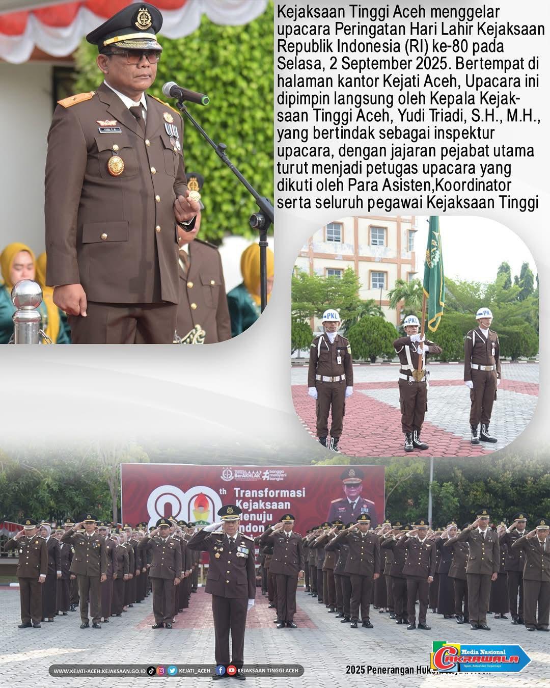 Aceh,Cakrawala-Bertempat di halaman kantor Kejati Aceh, Upacara ini dipimpin langsung oleh Kepala Kejaksaan Tinggi Aceh, Yudi Triadi, S.H., M.H., yang bertindak sebagai inspektur upacara, dengan jajaran pejabat utama turut menjadi petugas upacara yang dikuti oleh Para Asisten,Koordinator serta seluruh pegawai Kejaksaan Tinggi Aceh