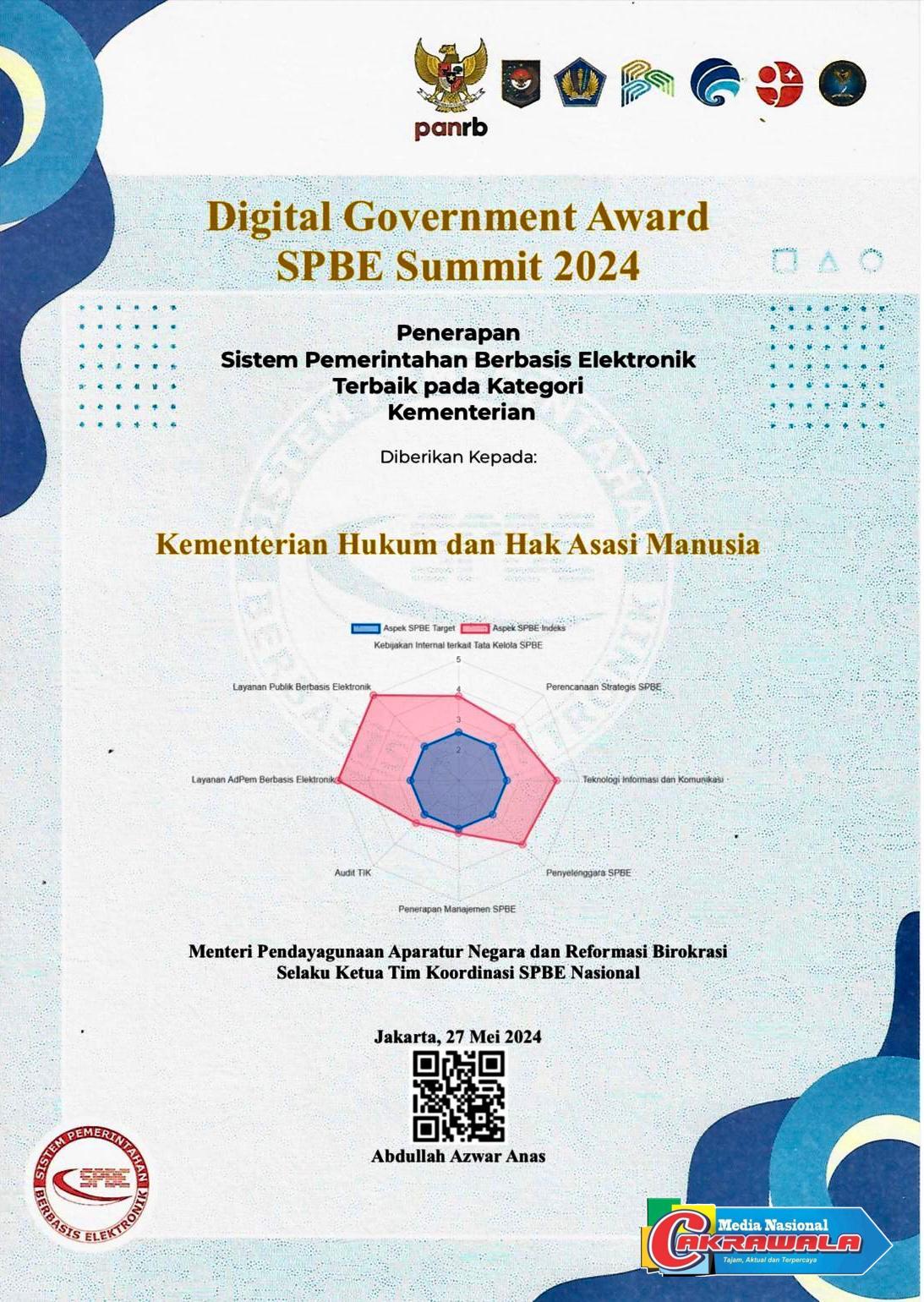 Jakarta, MN Cakrawala– Kementerian Hukum dan HAM (Kemenkumham) kembali meraih Digital Government Award Sistem Pemerintahan Berbasis Elektronik (SPBE) Summit tahun 2024. Kemenkumham menjadi yang terbaik dalam Penerapan Sistem Pemerintahan Berbasis Elektronik untuk kategori Kementerian.