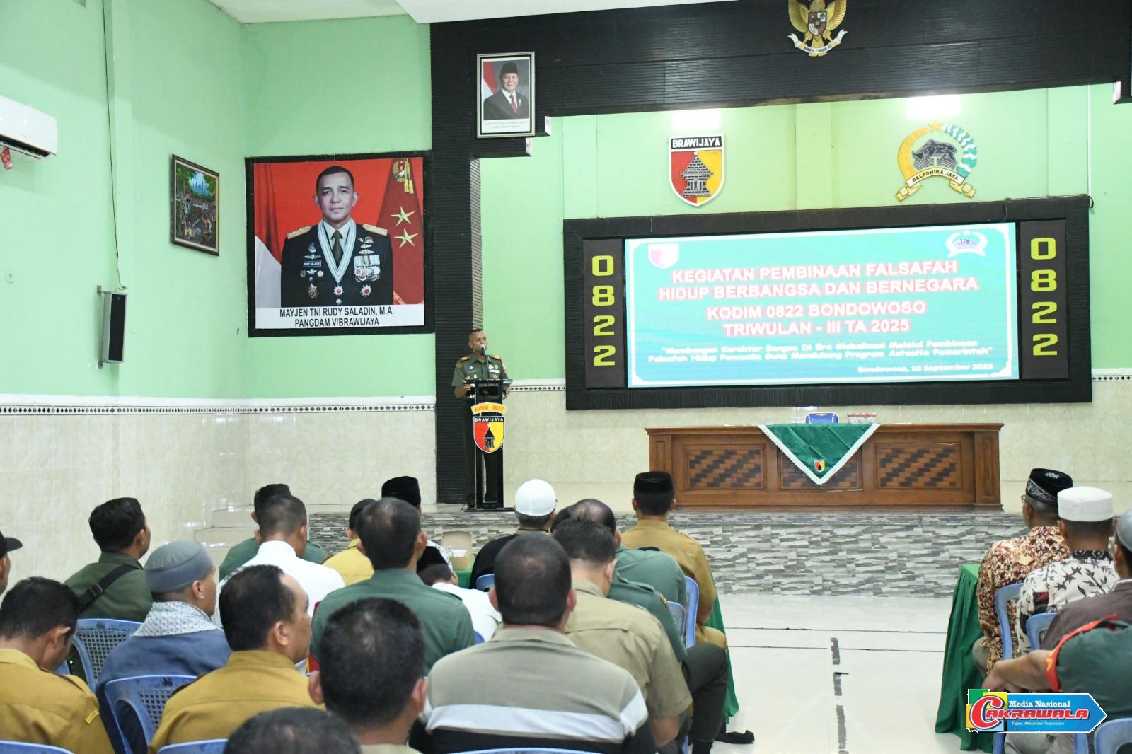 Bondowoso,Cakrawala – Selasa (16/9/2025) Dalam menghadapi tantangan era modern dan persaingan global, Kodim 0822 Bondowoso menggelar kegiatan Pembinaan Falsafah Hidup Berbangsa dan Bernegara di Aula Gedung Jenderal Sudirman, Kegiatan ini mengusung tema “Membangun Karakter Bangsa di Era Globalisasi melalui Pembinaan Falsafah Hidup Pancasila guna Mendukung Program Astacita Pemerintah”.