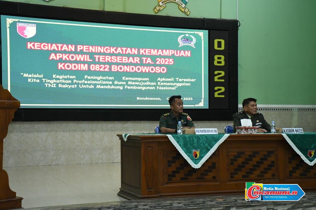 Bondowoso, MN Cakrawala – Komando Distrik Militer (Kodim) 0822/Bondowoso menggelar kegiatan Peningkatan Kemampuan Aparat Komando Kewilayahan (Apkowil) Tersebar Tahun Anggaran 2025, bertempat di Aula Makodim 0822 Bondowoso, pada bulan Oktober 2025. Kegiatan ini diikuti oleh seluruh Babinsa jajaran Kodim 0822 dengan tujuan untuk meningkatkan profesionalisme dan kemampuan teritorial dalam mendukung tugas pokok TNI AD di wilayah binaan.selasa (28/10/2025)