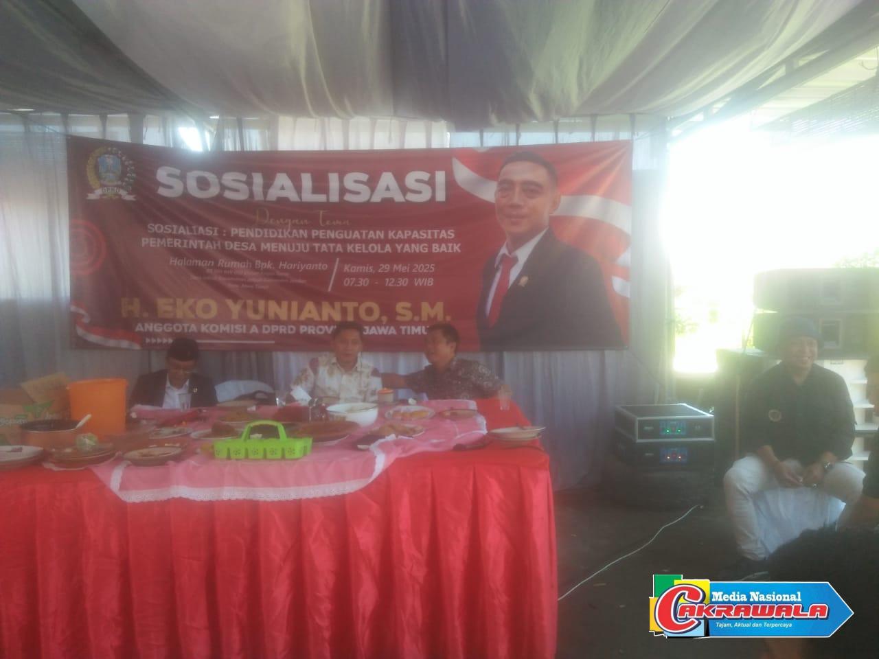 Jember,MN Cakrawala-Anggota komisi A DPRD Provinsi Jawa Timur, H. Eko Yunianto dari Fraksi PDIP, menggelar kegiatan sosialisasi di desa jelbuk kabupaten jember, yang bertema pendidikan penguatan kapasitas pemerintah menuju tata kelola yang baik, kamis, (29/5/2025)