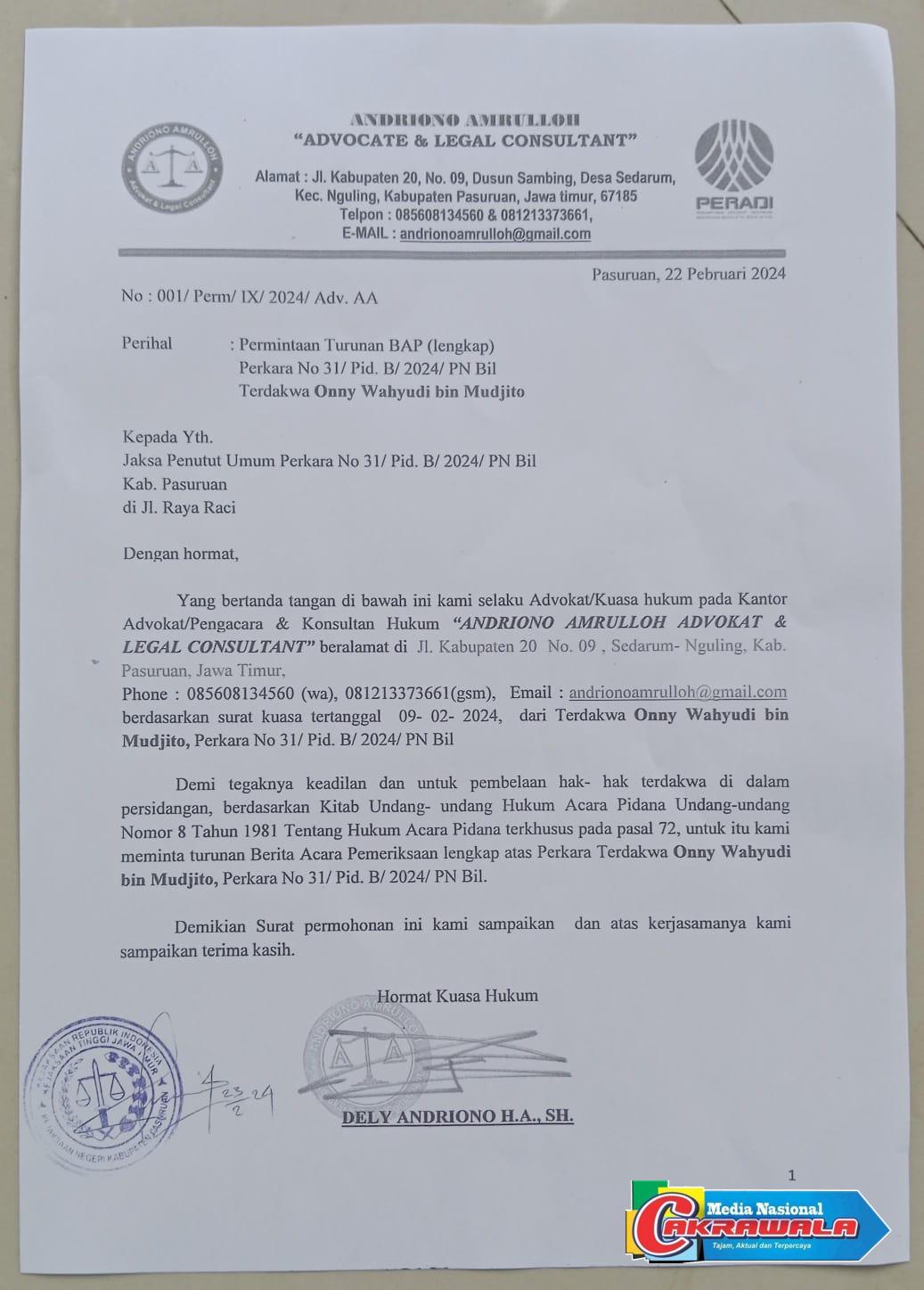 Sebagai kuasa hukum dari terdakwa Onny pada sidang pertama (pembacaan dakwaan) sudah mengajukan permintaan turunan BAP sesuai pasal 72 KUHAP, pada saat itu hakim ketua memerintah JPU untuk memberikan BAP tersebut,