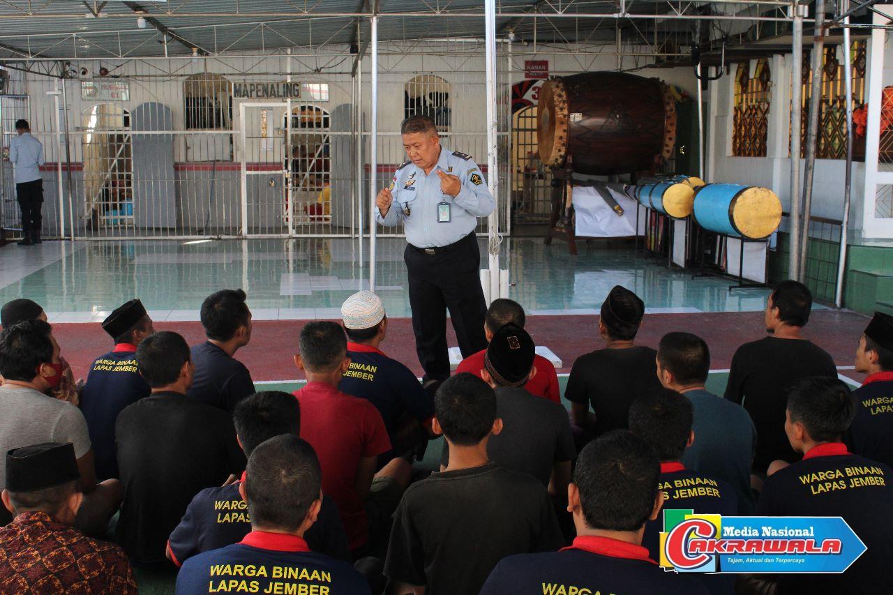 Kasi Administrasi Keamanan dan Ketertiban Lapas Jember, Sumiaji bersama jajarannya berkunjung ke blok narapidana dan tahanan untuk memberikan pemahaman.