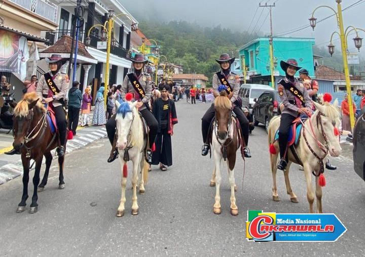 Dengan menunggang kuda yang telah dilatih, para Polwan berkeliling menyusuri kawasan wisata sambil memantau situasi kamtibmas secara langsung.