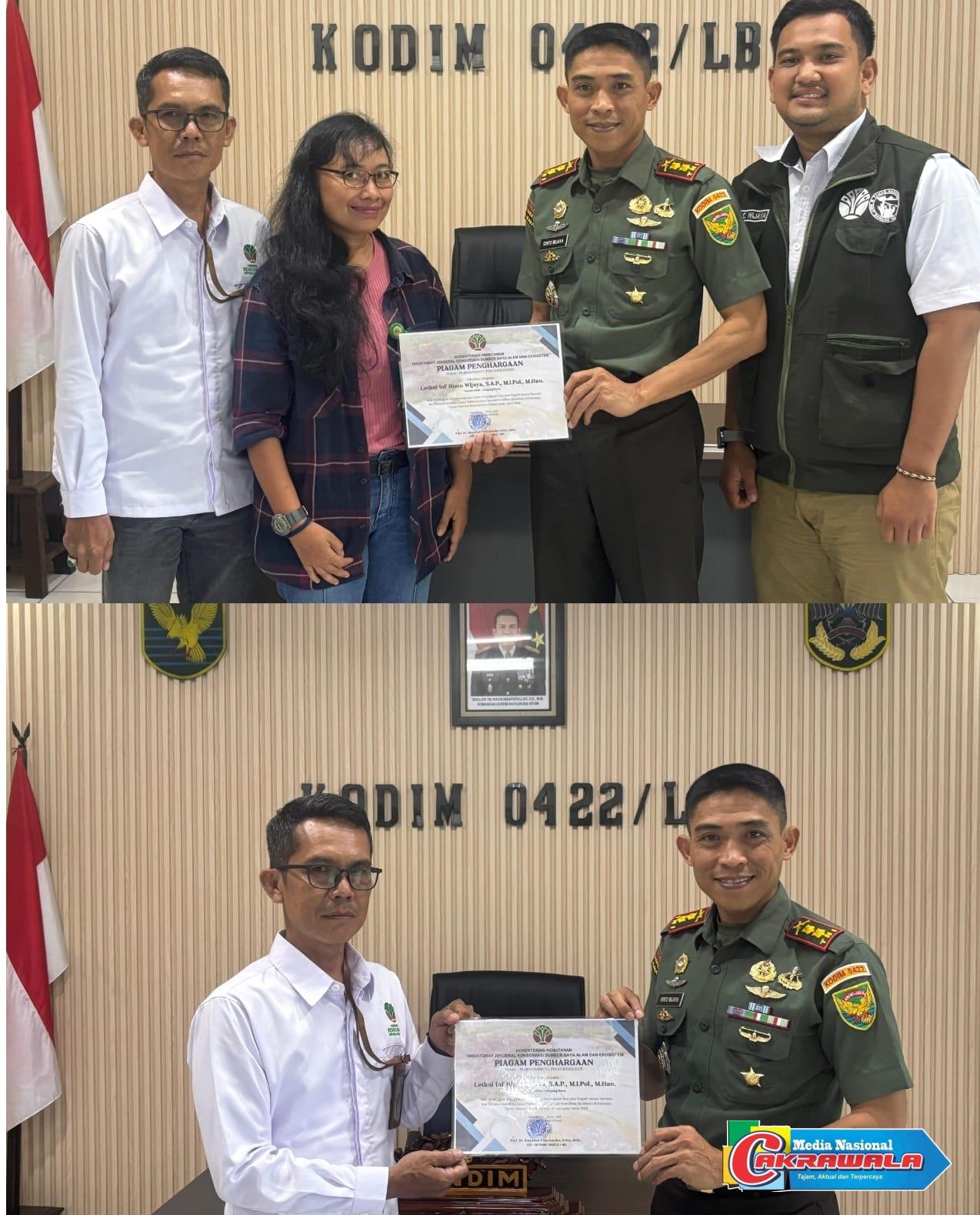 Lampung Barat,Cakrawal-Kamis (5/6/2025) — Komandan Kodim 0422/Lampung Barat, Letnan Kolonel Inf Rinto Wijaya, S.A.P., M.I.Pol., M.Han., menerima piagam penghargaan dari Kementerian Lingkungan Hidup dan Kehutanan Republik Indonesia. Penghargaan ini diberikan atas peran aktif dan dukungan Kodim 0422/LB dalam penanganan interaksi negatif antara manusia dan harimau Sumatra, serta keberhasilan pelaksanaan operasi pemulihan ekosistem di kawasan Taman Nasional Bukit Barisan Selatan (TNBBS).