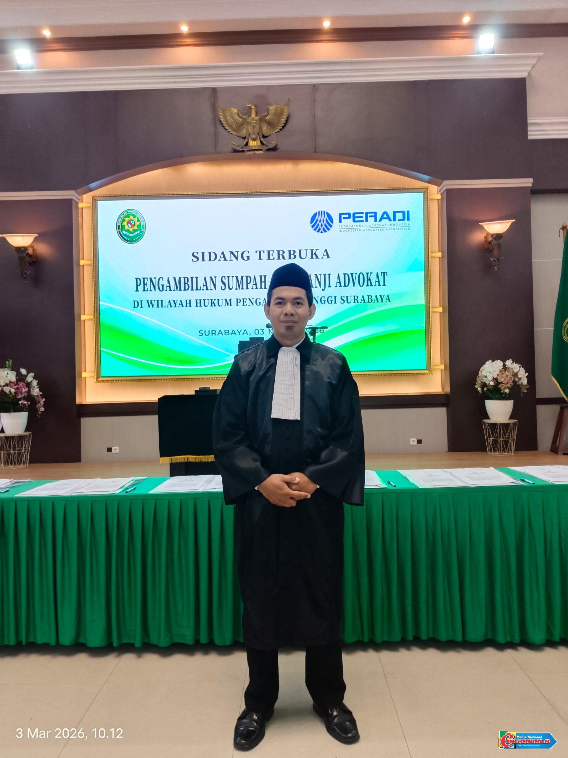 SURABAYA,MN Cakrawala – Hermansya Rachmadtullah, S.H., kini resmi menyandang profesi sebagai advokat setelah dilantik dan diambil sumpahnya oleh Ketua Pengadilan Tinggi Surabaya, Sujatmiko, S.H., M.H., Selasa (3/3/2026). Prosesi sakral tersebut berlangsung di ruang sidang utama PT Surabaya, Jalan Sumatera, Kota Surabaya, Jawa Timur.