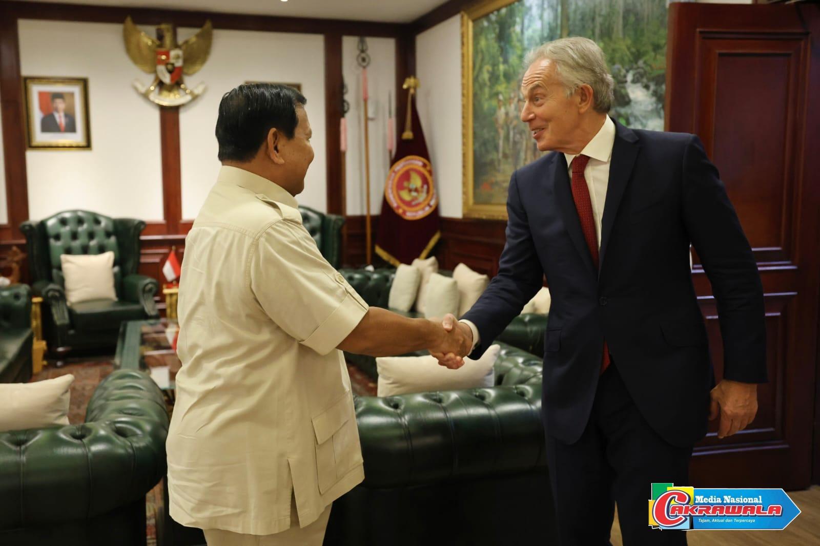 Jakarta,MNCakrawala-Menteri Pertahanan RI Prabowo Subianto menerima kunjungan Perdana Menteri Inggris Raya (1997-2007) dan Executive Chairman Tony Blair Institute, Mr. Tony Blair, di Kementerian Pertahanan, Jakarta, Jumat (19/4/2024).