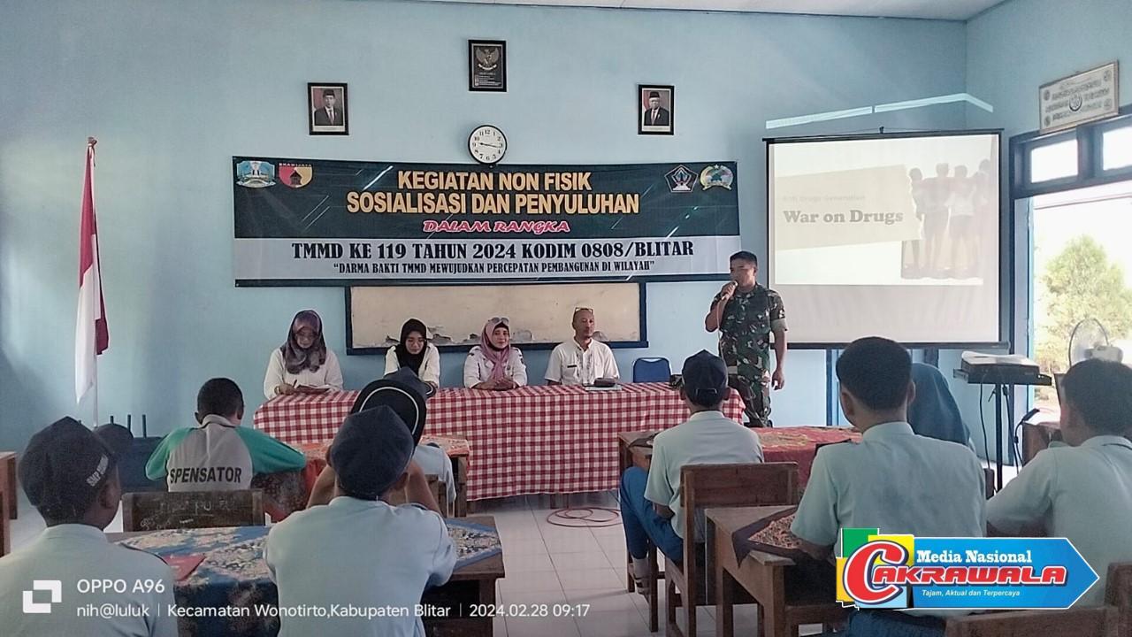 TNI Manunggal Membangun Desa (TMMD) ke-119 Tahun 2024 Kodim 0808/Blitar bekerjasama dengan BNN Blitar menggelar penyuluhan tentang bahaya Narkoba kepada masyarakat dan para pemuda, di SMPN 1 Wonotirto, Kecamatan Wonotirto, Kabupaten Blitar, Rabu (28/2/2024).