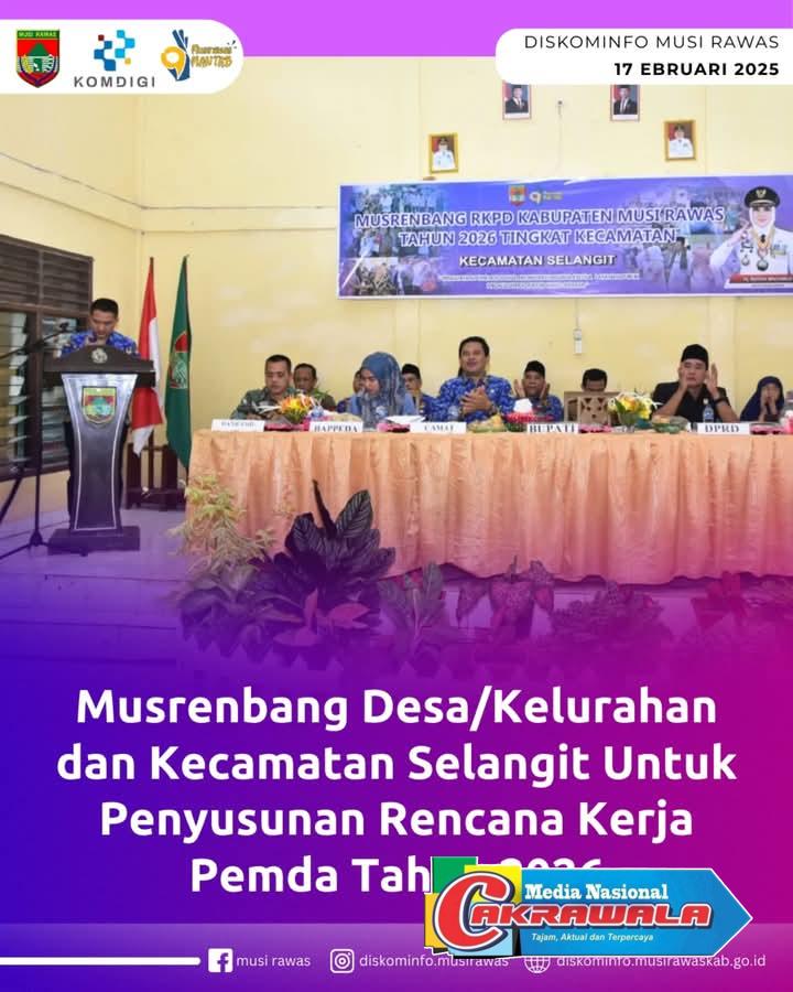 Media Nasional Cakrawala .com, Musi Rawas-Musrenbang Desa/Kelurahan dan Kecamatan Tahun 2025 untuk Penyusunan Rencana Kerja Pemerintah Daerah Tahun 2026 di Gedung Serbaguna Kecamatan Selangit, Senin (17/02/2025).