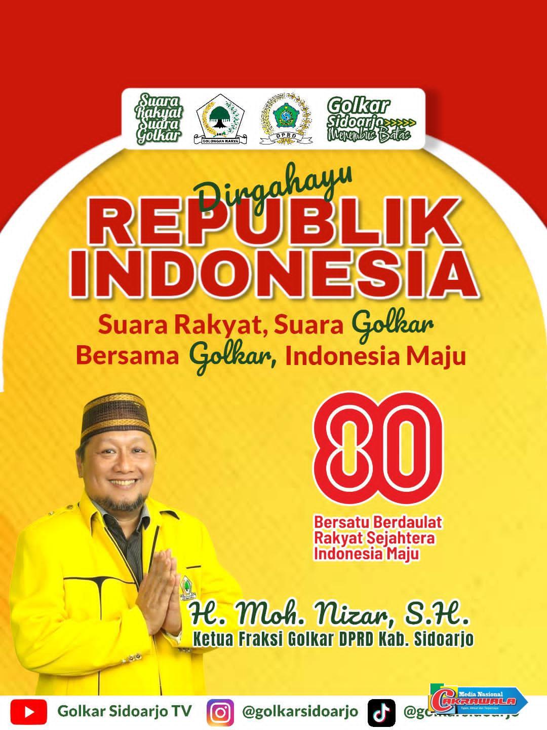 Sidoarjo, MN Cakrawala– Mohammad Nizar yang saat ini menjabat sebagai ketua fraksi Golongan Karya (Golkar) Dewan Perwakilan Rakyat Daerah (DPRD) Kabupaten Sidoarjo mengucapkan “Dirgahayu Republik ke-80”, 17 Agustus 1945 – 17 Agustus 2025.