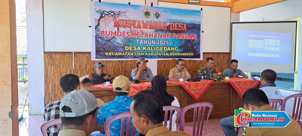 Bondowoso,Cakrawala– Semangat kebersamaan dan gotong royong terasa dalam Musyawarah Desa (Musdes) yang digelar di Balai Desa Kaligedang, Kecamatan Ijen, Kabupaten Bondowoso, Rabu (24/9/2025). Agenda kali ini membahas program Badan Usaha Milik Desa (Bumdes) bidang ketahanan pangan tahun 2025.